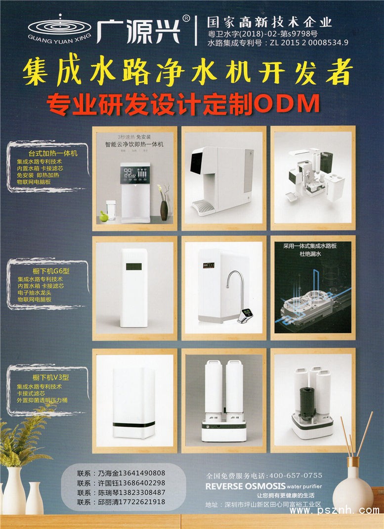 深圳廣源興實(shí)業(yè)發(fā)展有限公司涵括了家用、商用、工業(yè)等方面的眾多產(chǎn)品,產(chǎn)品性能優(yōu)良,款式新穎,多次的小區(qū)推廣證明,終端消費(fèi)者對(duì)廣源興產(chǎn)品的認(rèn)可度比較高,根據(jù)中國不同地區(qū)的水域文化,南方水軟,北方水硬,廣源興公司因地制宜,推出相匹配的產(chǎn)品,如廚房超濾機(jī)、廚房純水機(jī)、中央超濾機(jī)、中央純水機(jī)、直飲超濾機(jī)、直飲純水機(jī)、能量水機(jī)、軟水機(jī)等?,F(xiàn)公司正向中國各個(gè)省份陸續(xù)建立多個(gè)售后服務(wù)點(diǎn)以滿足消費(fèi)者用上健康水的需求。