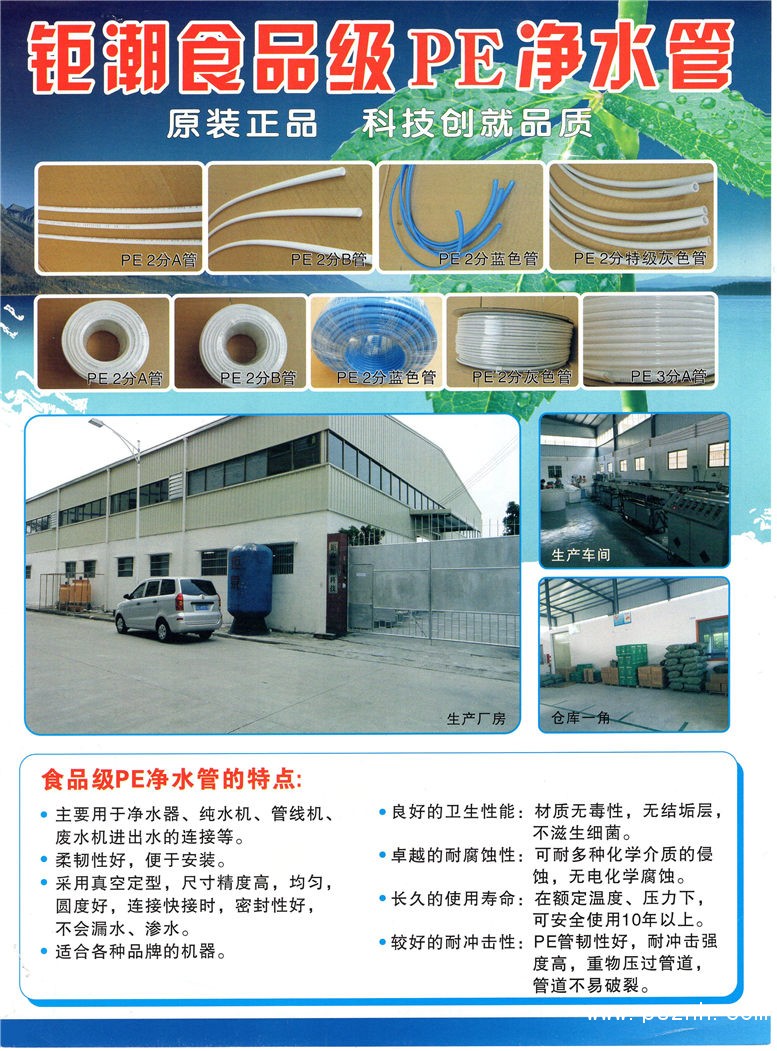 東莞市鉅潮凈水科技有限公司是2分PE管、3分PE管、PE管等產(chǎn)品專業(yè)生產(chǎn)加工的公司,擁有完整、科學(xué)的質(zhì)量管理體系。東莞市鉅潮凈水科技有限公司的誠(chéng)信、實(shí)力和產(chǎn)品質(zhì)量獲得業(yè)界的認(rèn)可。歡迎各界朋友蒞臨參觀、指導(dǎo)和業(yè)務(wù)洽談。