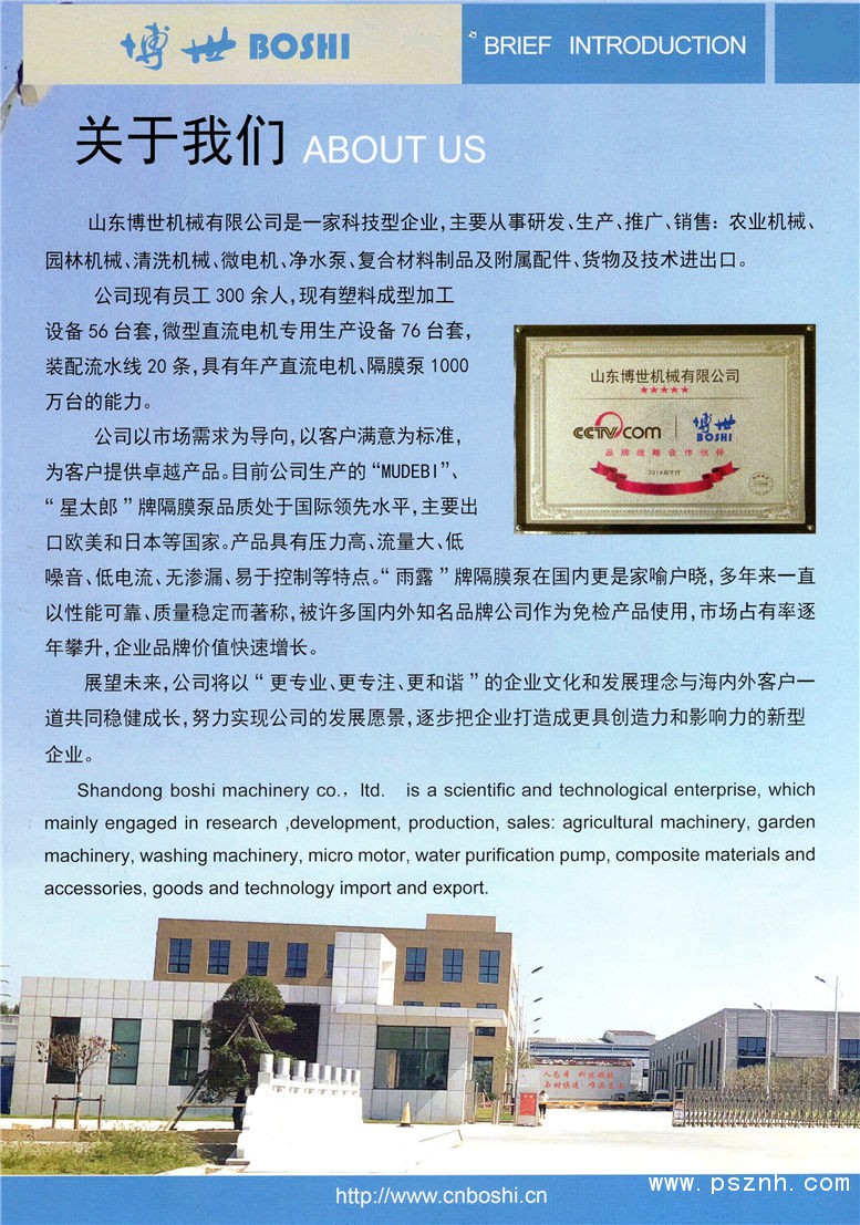 山東博世機(jī)械有限公司 凈水科技類 常規(guī)增壓泵系列 恒壓增壓泵系列 自吸增壓泵系列 節(jié)能增壓泵系列 農(nóng)林科技系列 果林專用泵系列 靜電噴霧泵系列 洗車器用泵系列 智能潛水泵系列 其他配件系列 泵用