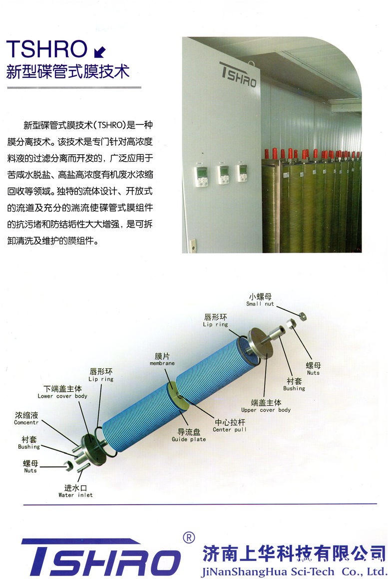 公司研發(fā)的 TSHRO 品牌系列的碟管式反滲透( TSHRO )、碟管式納濾( TSHNF )、寬流道反滲透( TSHTRO)、寬流道納濾( TSHTNF )以及高溫高壓碟管式反滲透( TSHHRO )系列產(chǎn)品,廣泛應(yīng)用于高濃度、高鹽度有機廢水的濃縮減量處理。 特別針對垃圾滲濾液、市政污水、電力、化工、冶金、醫(yī)藥、食品、海水淡化、高鹽高濃度有機廢水等行業(yè),和蒸發(fā)系統(tǒng)相結(jié)合,基本實現(xiàn)透過液回用和廢水的零排放。
