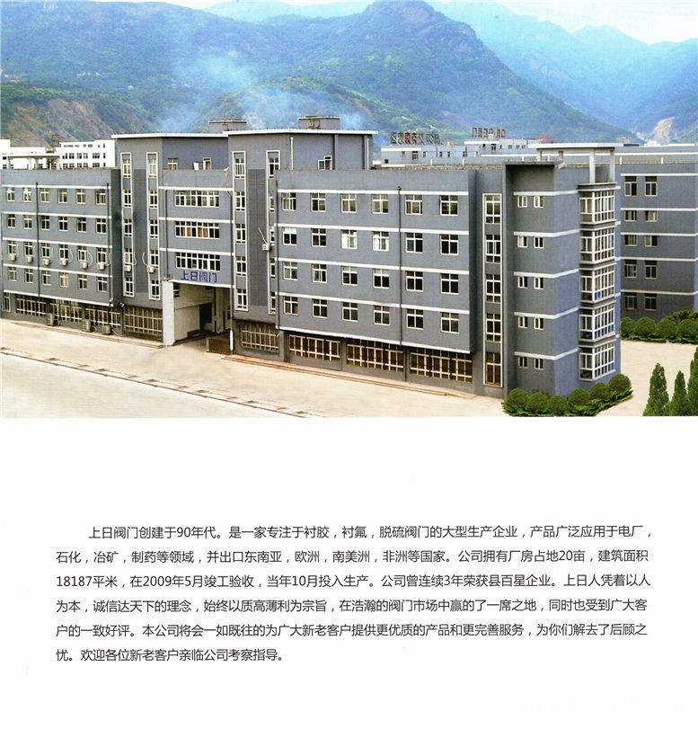 永嘉縣上日閥門廠,至今已有多年的生產(chǎn)歷史,位于聞名全國的閥門之鄉(xiāng)——甌北鎮(zhèn)張堡工業(yè)區(qū),是一家專業(yè)生產(chǎn)襯膠閥門,襯氟閥門:隔膜閥、截止閥、止回閥,以及引進英國“桑德斯”(SAUNDERS)標準隔膜閥的重點骨干企業(yè)。已通過ISO9001質(zhì)量體系認證,并擁有雄厚的技術力量和先進的生產(chǎn)工藝 。企業(yè)利用現(xiàn)在高新科技和精良的設備,集科研、設計、生產(chǎn)、銷售及售后服 務為一體,始終以高質(zhì)量尋求市場為宗旨,爭創(chuàng)一流的企業(yè)。