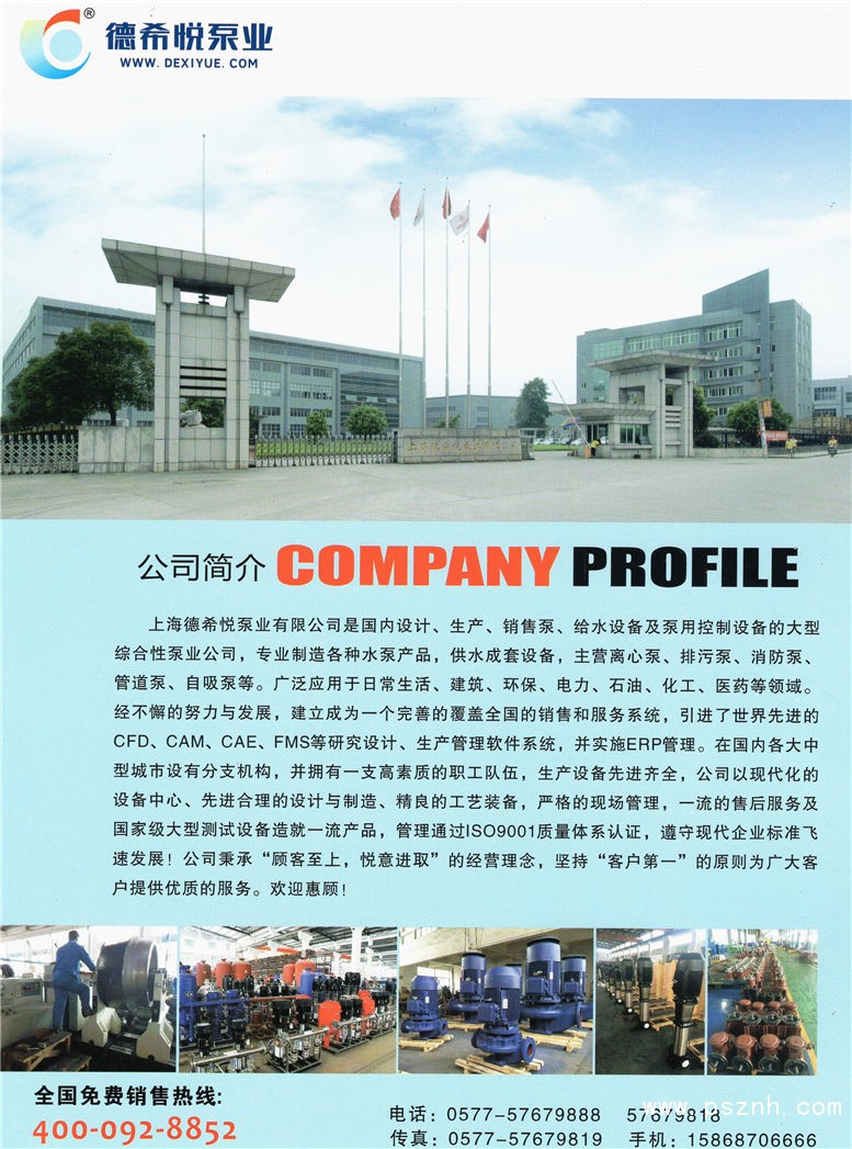 上海德希悅泵業(yè)有限公司是國內設計、生產(chǎn)、銷售泵、給水設備及泵用控制設備的大型綜合性泵業(yè)公司,專業(yè)制造各種水泵產(chǎn)品,供水成套設備,主營離心泵、排污泵、消防泵、管道泵、自吸泵等。廣泛應用于日常生活、建筑、環(huán)保、電力、石油、化工、醫(yī)藥等領域。經(jīng)不懈的努力與發(fā)展,建立成為一個完善的覆蓋全國的銷售和服務系統(tǒng),引進了世界先進的CFD、CAM、CAE、FMS等研究設計、生產(chǎn)管理軟件系統(tǒng),并實施ERP管理。在國內各大中型城市設有分支機構,并擁有一支高素質的職工隊伍,生產(chǎn)設備先進齊全,公司以現(xiàn)代化的設備中心、先進合理的設計與制造、精良的工藝裝備,嚴格的現(xiàn)場管理,一流的售后服務及國家級大型測試設備造就一流產(chǎn)品,管理通過ISO9001質體系認證,遵守現(xiàn)代企業(yè)標準飛速發(fā)展!公司秉承“顧客至上,悅意進取”的經(jīng)營理念,堅持“客戶第一”的原則為廣大客戶提供優(yōu)質的服務。歡迎惠顧!