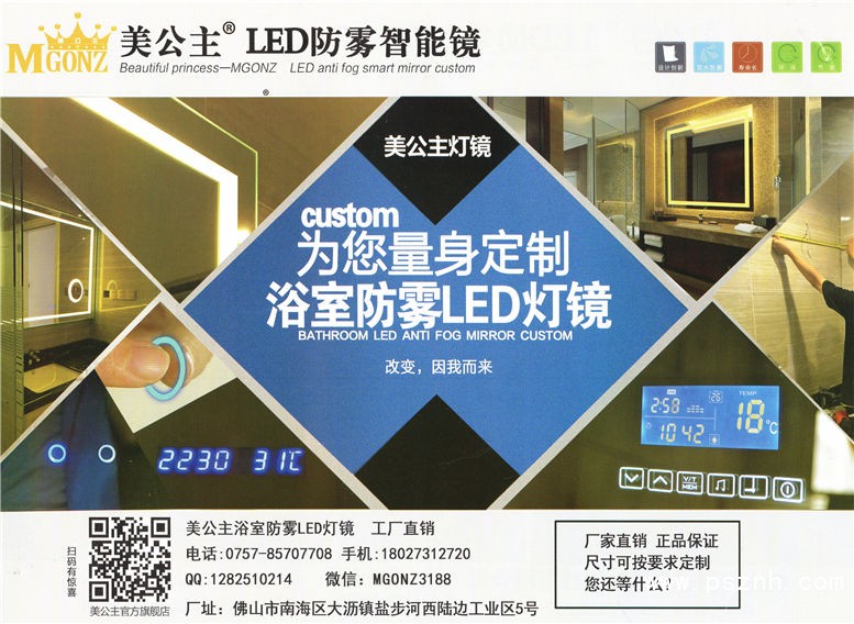 佛山市美視界智能科技有限公司是一家集生產(chǎn),銷售,安裝于一體的綜合性企業(yè),我們專業(yè)生產(chǎn):LED浴室鏡、智能電視鏡、防霧浴室鏡、藍牙音樂燈鏡,不銹鋼燈鏡,酒店定制衛(wèi)浴鏡,智能鏡柜等,可按客戶圖紙要求定制。我們的名字:美公主我們的產(chǎn)品主要出口世界各地,為很多豪華酒店、賓館,政府單位、商務辦公樓、百貨廣場、機場、家裝等服務過 我們不斷探索和創(chuàng)新,以“優(yōu)越的質(zhì)量,服務至上”的宗旨,以優(yōu)良的產(chǎn)品贏得廣大客戶的信任與支持。