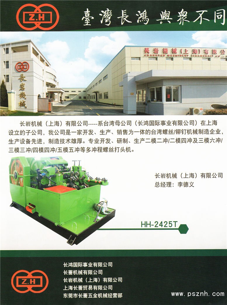 臺灣二模四沖多功位螺絲打頭機我司長巖機械(上海)有限公司是臺灣長鴻機械廠在上海的分公司。長鴻機械廠  是一家集開發(fā),生產(chǎn),銷售、為一體的臺灣螺絲機械制造企業(yè),生產(chǎn)設(shè)備先進,制造技術(shù)雄厚,檢測設(shè)備完善,經(jīng)過多年設(shè)計試驗,專業(yè)開發(fā)研制,(二模四沖)(二模二沖)(三模三沖)多沖程螺絲打頭機及鉚釘打頭機。