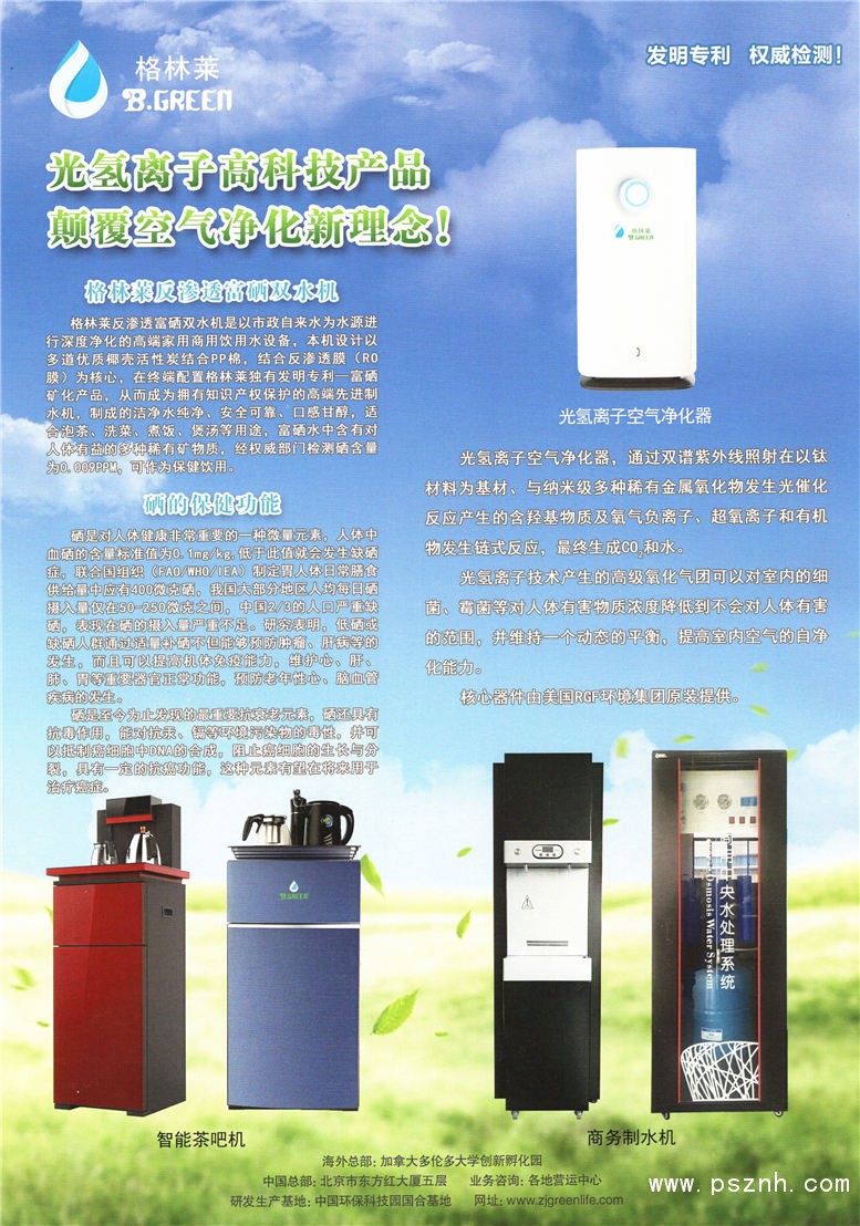 浙江格林萊凈化科技有限公司--美國高端凈水品牌,在家用、商用、醫(yī)用及空氣凈化領(lǐng)域擁有多項核心技術(shù)和產(chǎn)品,包括家用商用反滲透結(jié)合富硒雙水機、智能售水機、高端茶吧機、節(jié)能加熱器、光氫離子空氣凈化器等產(chǎn)品,公司依托國內(nèi)外先進技術(shù)不斷研發(fā)適合中國國情之產(chǎn)品,致力于高端健康產(chǎn)品的研發(fā)制造。
