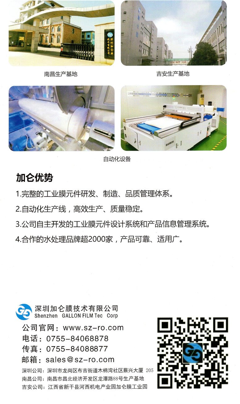 深圳加侖膜技術(shù)有限公司(以下簡稱GALLON)是集反滲透膜組件研發(fā)生產(chǎn)、膜設備制造應用及工程水處理系統(tǒng)設計施工為一體的高科技企業(yè)。