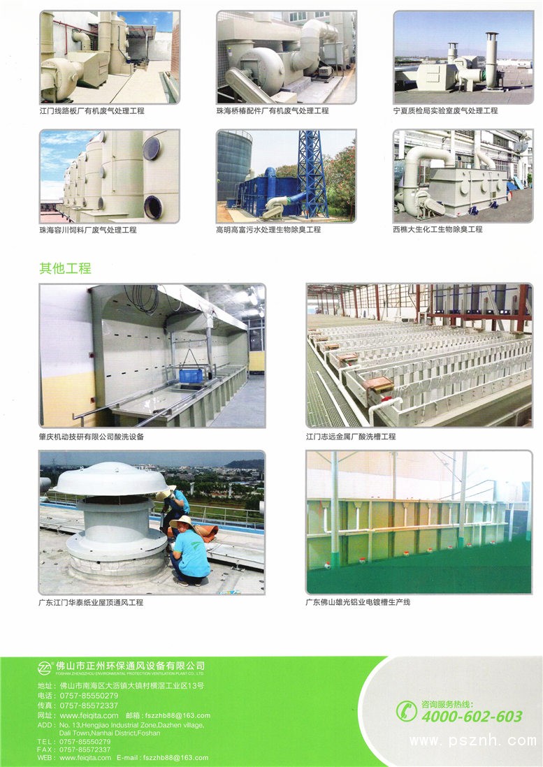 公司擁有三條廢氣處理設(shè)備生產(chǎn)線,分別為玻璃鋼制品生產(chǎn)線、塑料制品生產(chǎn)線、鋼材制品生產(chǎn)線。專業(yè)生產(chǎn)防腐風(fēng)機(jī)、廢氣凈化設(shè)備、各種配件。主要產(chǎn)品有:玻璃鋼風(fēng)機(jī)、塑料風(fēng)機(jī)、離心風(fēng)機(jī)、軸流風(fēng)機(jī)、斜流風(fēng)機(jī)、屋頂風(fēng)機(jī)、廢氣凈化塔、脫硫塔、活性炭吸附箱、生物過濾塔、UV光解、等離子、濕式靜電除煙霧器、酸洗槽、電解槽、吸風(fēng)罩、風(fēng)機(jī)殼、葉輪、風(fēng)閥、管道、消音器等。目前擁有七項(xiàng)國(guó)家實(shí)用新型專利,兩項(xiàng)廣東省高新技術(shù)產(chǎn)品。