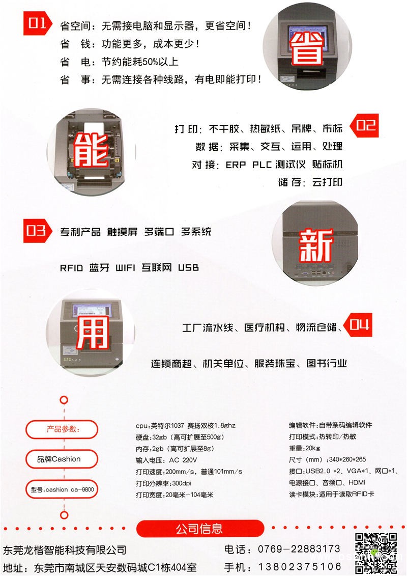東莞龍楷智能科技有限公司(旗下品牌-CASHION 楷軒)位于全球制造之都-廣東東莞,是一家專業(yè)從事研發(fā)、銷售、服務(wù)于一體的高新技術(shù)企業(yè),致力于為企業(yè)提供智能軟硬件產(chǎn)品、智能條碼打印機(jī)、RFID打印機(jī)、物聯(lián)網(wǎng)打印機(jī)、智能數(shù)據(jù)采集終端、智能工控電腦、智能電子秤等系列智能設(shè)備。 廣泛應(yīng)用于工業(yè)制造、醫(yī)療、倉儲、物流、政務(wù)、圖書館、商超等領(lǐng)域。