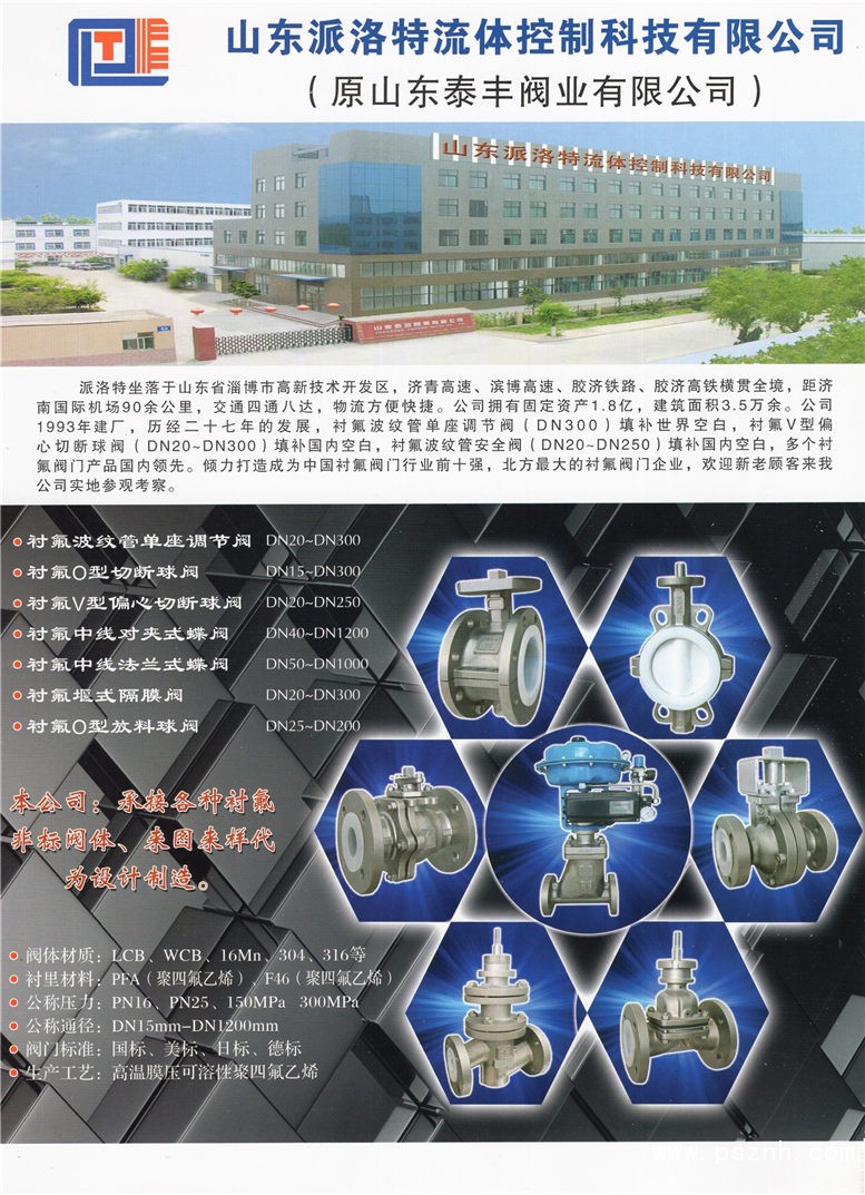 山東派洛特流體控制科技有限公司(原山東泰豐閥業(yè)有限公司)坐落于山東省淄博市高新技術(shù)開(kāi)發(fā)區(qū),東鄰國(guó)內(nèi)鹽化基地濰坊壽光,西鄰山東省會(huì)泉城濟(jì)南,南鄰北方商貿(mào)基地臨沂,北鄰勝利油田(中國(guó)油城)東營(yíng)。濟(jì)青高速、濱博高速、膠濟(jì)鐵路、膠濟(jì)高鐵橫貫全境,距濟(jì)南國(guó)際機(jī)場(chǎng)90余公里,交通四通八達(dá),物流方便快捷。公司擁有固定資產(chǎn)1.5億,建筑面積3.5萬(wàn)余㎡。擁有數(shù)控加工中心、數(shù)控車(chē)床、普通車(chē)(銑)鉆床、襯氟熱固化成型機(jī)、襯氟模壓機(jī)、襯氟自動(dòng)電爐、數(shù)控熔化爐等大型生產(chǎn)設(shè)備150余臺(tái);擁有國(guó)標(biāo)、美標(biāo)、日標(biāo)、德標(biāo)襯氟球閥、蝶閥、截止閥、隔膜閥、止回閥、閘閥等襯氟專(zhuān)用模具600余套;擁有氦質(zhì)譜檢測(cè)儀、金屬光譜檢驗(yàn)儀、波紋管疲勞檢驗(yàn)測(cè)試臺(tái)、磁粉探傷儀、電火花檢驗(yàn)儀、壓力測(cè)試臺(tái)、超聲波脫脂除油設(shè)備等檢測(cè)設(shè)備50余臺(tái);年生產(chǎn)能力達(dá)3.5萬(wàn)余臺(tái)/套。是國(guó)內(nèi)氯堿、純堿、聚氯乙烯、氫氟酸、環(huán)氧丙烷、雙氧水、氯化石蠟、甲烷氯化物、氟硅、多晶硅、三氯氫硅、有機(jī)硅、鹽酸、液氨等化工工業(yè)專(zhuān)用閥門(mén)、氯氣專(zhuān)用閥門(mén)、襯氟閥門(mén)領(lǐng)域?qū)I(yè)制造商;是國(guó)內(nèi)早期按照歐氯協(xié)會(huì)(EuroChlor)標(biāo)準(zhǔn)生產(chǎn)氣氯、液氯及危險(xiǎn)介質(zhì)專(zhuān)用閥門(mén)的制造廠家。是中國(guó)氯堿工業(yè)協(xié)會(huì)會(huì)員廠,中國(guó)有機(jī)硅工業(yè)協(xié)會(huì)會(huì)員廠、中國(guó)制冷工業(yè)協(xié)會(huì)會(huì)員廠,中國(guó)儀器儀表協(xié)會(huì)會(huì)員廠,山東省特種設(shè)備協(xié)會(huì)會(huì)員,是山東省閥門(mén)行業(yè)的龍頭企業(yè)。產(chǎn)品出口歐洲、東南亞等地區(qū)的三十多個(gè)國(guó)家和地區(qū)。