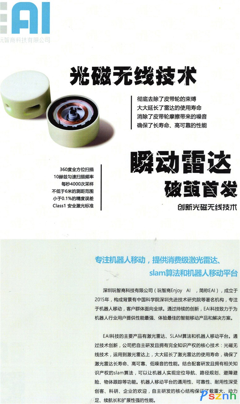 深圳玩智商科技有限公司(Enjoy AI ,簡(jiǎn)稱EAI),成立于2015年,專注于機(jī)器人移動(dòng),客戶群體面向全球。通過(guò)持續(xù)的創(chuàng)新,玩智商科技致力于為機(jī)器人行業(yè)用戶提供性能最強(qiáng)、體驗(yàn)最佳的智能移動(dòng)產(chǎn)品和解決方案。