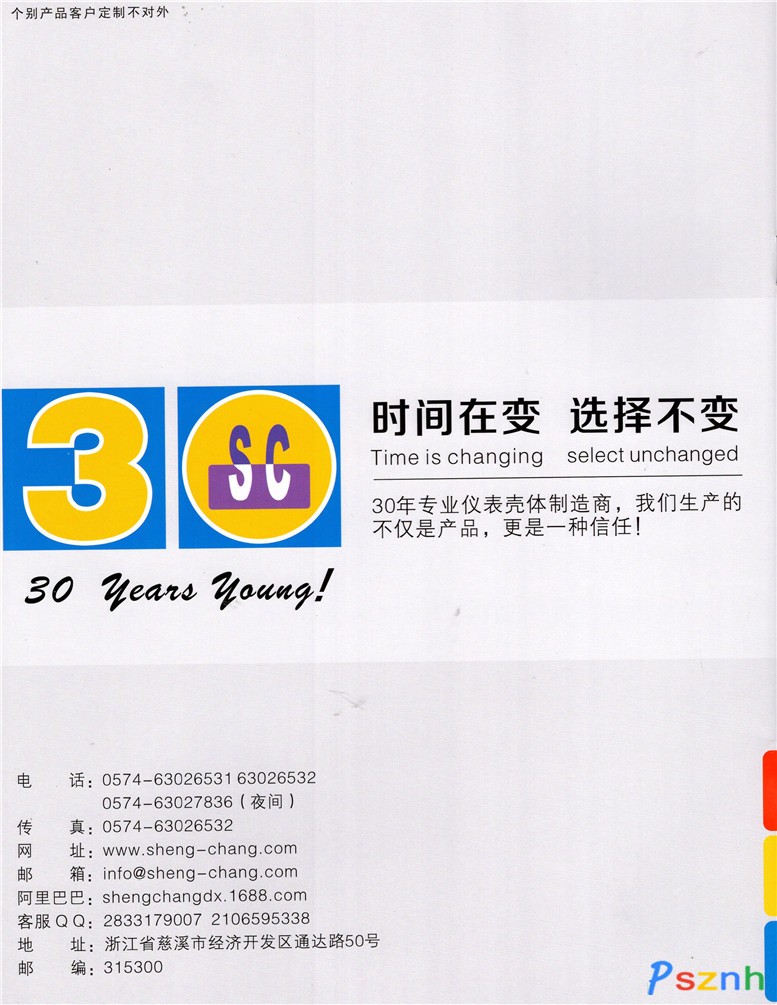 慈溪市盛昌電訊有限公司成立于1984年,是全國(guó)最早的溫度儀表外殼配套廠家之一。30年來(lái),秉承著盛昌人質(zhì)量為先、管理為本、信譽(yù)為重、服務(wù)為誠(chéng)的理念,牢牢把握住儀表行業(yè)的發(fā)展方向,使公司的規(guī)模不斷壯大,產(chǎn)品遠(yuǎn)銷海內(nèi)外。公司現(xiàn)有員工150余人,廠房3萬(wàn)多平方米,現(xiàn)有產(chǎn)品28大類,近2千多個(gè)品種,自有模具數(shù)3000余套,年模具開發(fā)200套,是國(guó)內(nèi)最大的電力儀表、溫度儀表、互感器、傳感器外殼生產(chǎn)廠商之一。