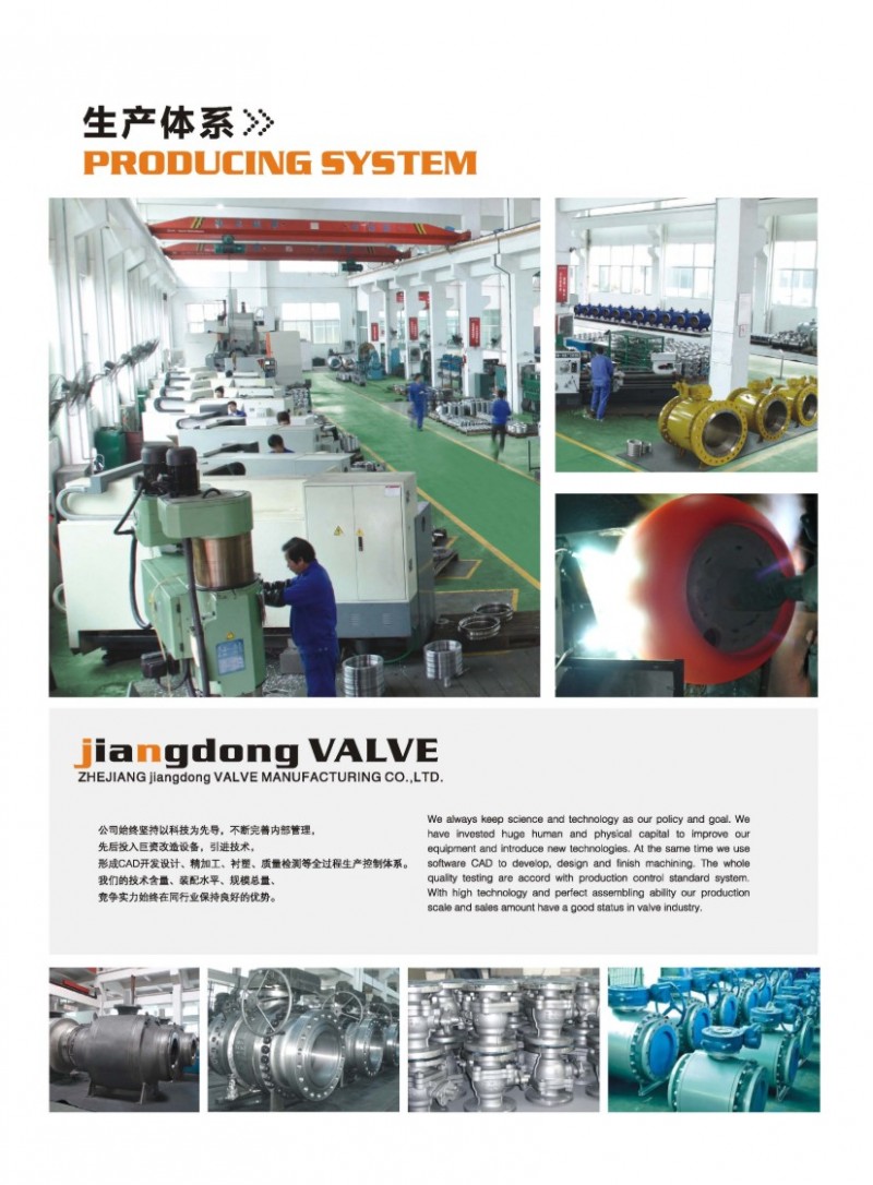 浙江江東閥門有限公司地處素有"中國泵閥之鄉(xiāng)"美譽的浙江永嘉縣東甌工業(yè)區(qū)林浦路上,南鄰甌江,近靠104 國道,交通極為便利。公司采用國際通用標準(API、DIN、JIS)和中國國家標準(GB),專業(yè)從事閥門產(chǎn)品的開發(fā)和制造已有十多年的歷史,主營產(chǎn)品為鑄鋼、鍛鋼及全焊接球閥。同時還生產(chǎn)多種規(guī)格的鑄鋼、鑄鐵蝶閥、閘閥、止回閥、截止閥和軟密封閥門。