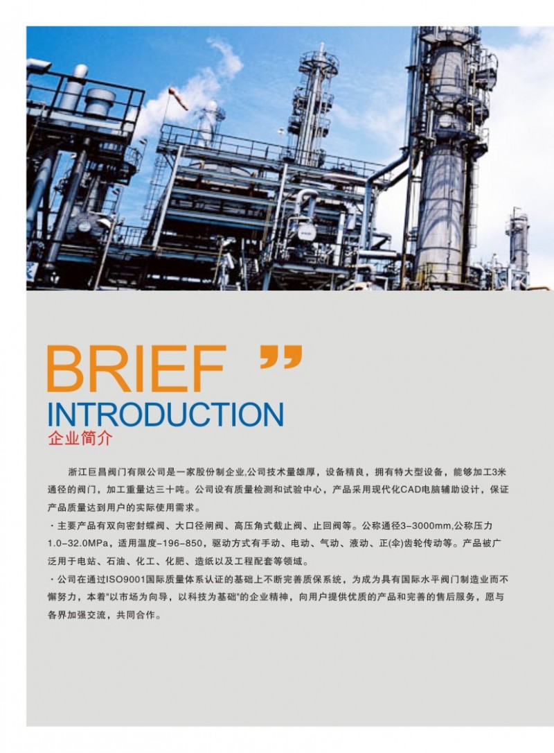 浙江巨昌閥門制造有限公司是一家股份制企業(yè),公司技術(shù)量雄厚,設(shè)備精良,擁有特大型設(shè)備,能夠加工3米通徑的閥門,加工重量達(dá)三十噸。公司設(shè)有質(zhì)量檢測(cè)和試驗(yàn)中心,產(chǎn)品采用現(xiàn)代化CAD電腦輔助設(shè)計(jì),保證產(chǎn)品質(zhì)量達(dá)到用戶的實(shí)際使用需求。