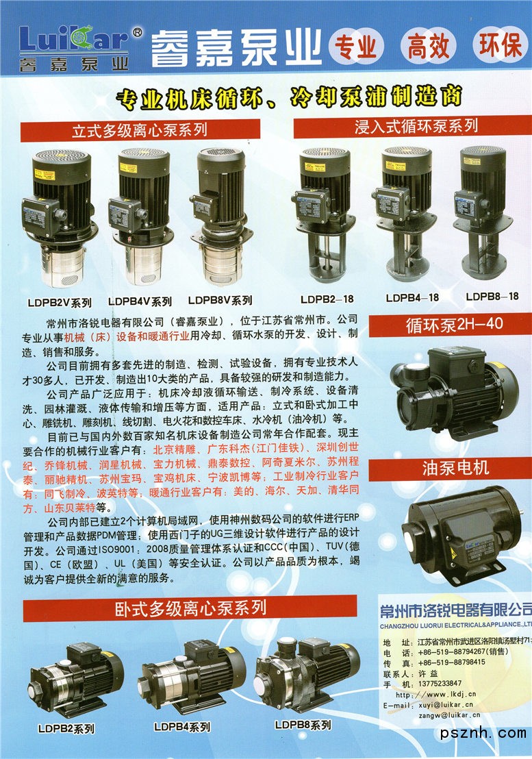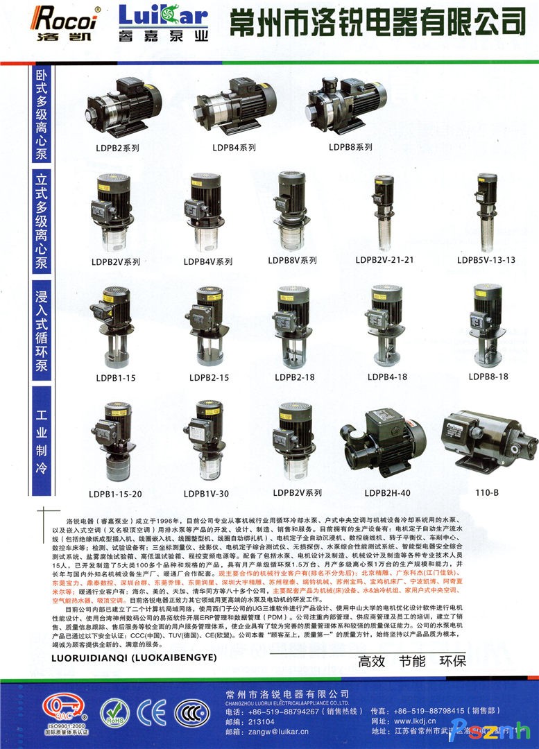 洛銳電器(睿嘉泵業(yè))成立于1996年,目前公司專業(yè)從事:戶式中央空調(diào)以及嵌入式空調(diào)(又名吸頂空調(diào))用循環(huán)泵 及排水泵、機(jī)床設(shè)備用冷卻循環(huán)水泵及機(jī)床設(shè)備冷卻系統(tǒng)用的水泵等產(chǎn)品的開發(fā)、設(shè)計(jì)、制造、銷售和服務(wù)。目前已經(jīng)配備的生產(chǎn)設(shè)備有:5條電機(jī)定子自動(dòng)生產(chǎn)流水線(包括絕緣紙成型插入機(jī)、全自動(dòng)繞線機(jī)、線圈嵌入機(jī)、線圈整型機(jī)、線圈全自動(dòng)綁扎機(jī))、電機(jī)定子全自動(dòng)沉浸機(jī)、全自動(dòng)焊接設(shè)備、車削中心、數(shù)控車床等;檢測(cè)、試驗(yàn)設(shè)備有:三坐標(biāo)測(cè)量?jī)x、投影儀、電機(jī)定子綜合測(cè)試儀、轉(zhuǎn)子平衡儀、水泵葉片平衡儀、無損探傷、水泵綜合性能測(cè)試系統(tǒng)、智能型電器安全綜合測(cè)試系統(tǒng)、鹽霧腐蝕試驗(yàn)箱、高低溫試驗(yàn)箱、灼熱絲試驗(yàn)儀、程控變頻電源等。配備了包括水泵、電機(jī)設(shè)計(jì)及制造、機(jī)械設(shè)計(jì)及制造等各種專業(yè)技術(shù)人員15人,已開發(fā)制造了8大類100多個(gè)品種和規(guī)格的產(chǎn)品,具備了較強(qiáng)的生產(chǎn)規(guī)模和制造能力,并長(zhǎng)年與國內(nèi)外知名機(jī)床設(shè)備生產(chǎn)廠商、暖通廠商及工業(yè)制冷廠商合作配套?,F(xiàn)長(zhǎng)年合作配套的機(jī)械行業(yè)客戶有:北京精雕科技、深圳臺(tái)群、廣東科杰(江門佳鐵)、潤(rùn)星科技股份、喬峰機(jī)械、寶力機(jī)械、蘇州程泰、富強(qiáng)科技、蘇州寶瑪、常州阿奇、凱博數(shù)控機(jī)械等;暖通行業(yè)及工業(yè)制冷客戶有:美的、海爾、天加、清華同方、貝萊特、妥思;同飛制冷、瑞科制冷等二百多家公司,主要配套產(chǎn)品為:所有系列機(jī)床設(shè)備、家用戶式中央空調(diào)、空氣能熱水器、吸頂空調(diào)、機(jī)床設(shè)備用水&油冷機(jī)組。目前洛銳電器正全面致力于其它領(lǐng)域用更高端的水泵及電動(dòng)機(jī)的研發(fā)工作。