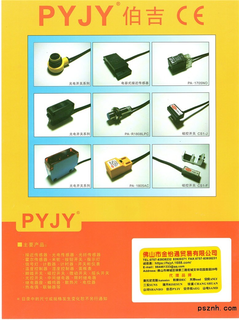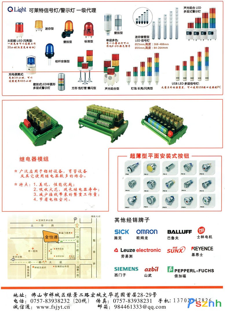 代理之臺灣牌子有: 天得 TEND (一級代理) 普耐UNA 安良 ANLY (一級代理) 臺安 TAIAN (一級代理) 松菱 CKC (一級代理) 理研 RIKEN 瑞升 RISESUN (一級代理) 戶上 PAK (TOGAMI)馬可 MACK (一級代理) 宣榮 CAHO 開放 KFPS (一級代理) “錩鋼”PLT 天弘 AUTENTO (一級代理) 國興 GOODSKY 漢鼎 AUSPICIOUS(AP)一級代理 仕通 STON 陽明 FOTEK (一級代理) 進聯(lián) DECA 凱士士 KSS (一級代理) GIKOKA 思諾奇 SHINOZAKI (一級代理) 亦電 E-TE N 山河 SHAN HO (一級代理) 銓盛 CHANG SHUAN 優(yōu)拉鋼 URACON (一級代理) 志方 JKN 友正 ANC (一級代理) 代理或經(jīng)銷之韓國牌子有: 奧托尼克斯 AUTonICS 大一電機 DAEIL 韓榮 HANYOUNG 大韓工控 TAEHAN 金星 LG 韓國 HANKUK 大洋 DAEYANG 三和 SAMWHA(EOCR)建興 KOINO(KUN HUNG) 可萊特 Q、Light 成浩 SUNGHO 普力士 POWNIX 霍尼韋爾 HonEYWELL 代理或經(jīng)銷之日本牌子有: 和泉 IDEC(一級代理) 歐姆龍 OMRON 日立 ITACHI 日本竹中TAKEX(一級代理) 東方 ORIENTAL 三菱 MITSUBISHI 神鋼 SHINKO 富士 FUSI 日東 NITTO 光陽 KOYO ZIPPY 理工 RKC NEC、TAKAMISAWA 神視 SUNX 東邦 TOHO 萊茵 LINE “千野牌” CHINO 松下 NATIonAL /NAIS “國字牌” OKUSAI 島電 SHIMADEN “共同牌” YODO 竹中 TAKEX “豐和牌” FENWAL 施克光 SICK “寺峙牌” TERASAKI 西門子 SIEMENS TOCOS 北洋 HOKUYO 神港 SHINKO 東芝 TOSHIBA 安川 YASKAWA OPTEX KANOMAX“加野麥克斯”榮通信 SAKAE TSUSHIN KOGYO ALNOR、CREST