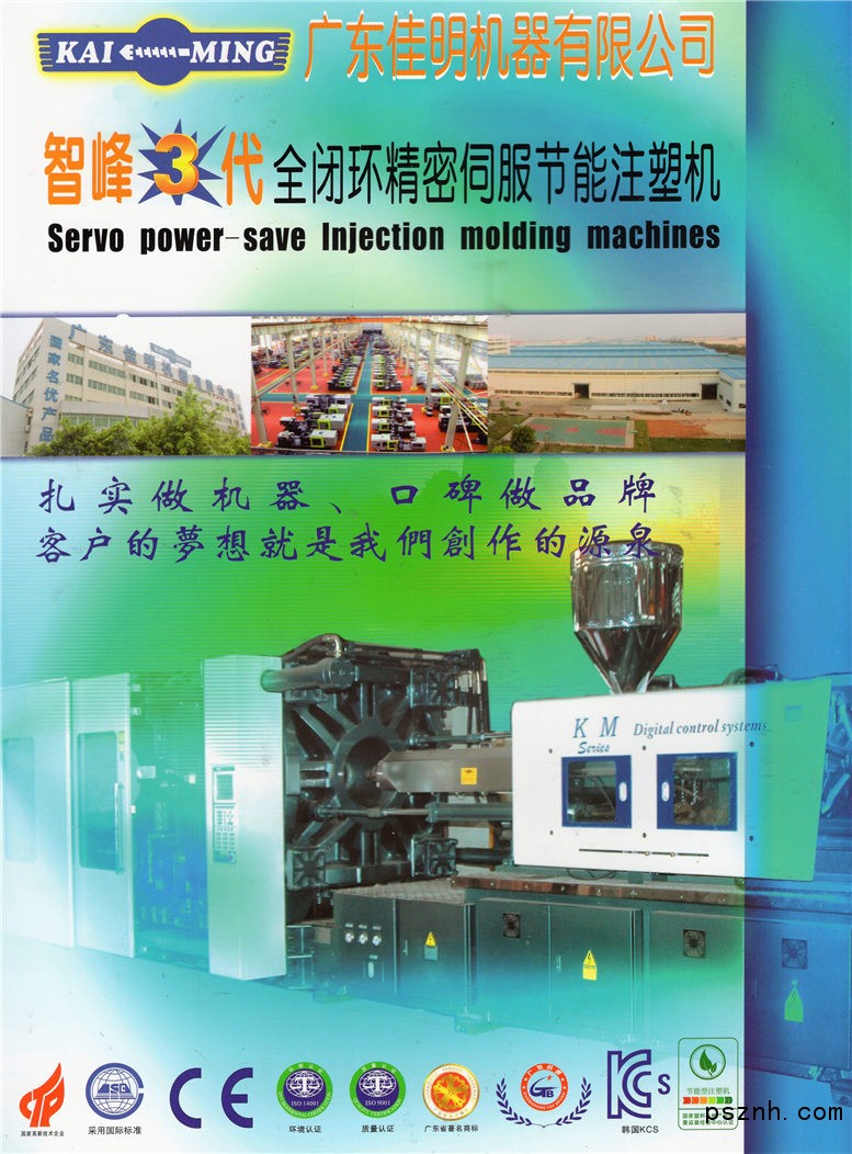 公司目前擁有先進的五軸聯(lián)動機加工中心機和數(shù)控車床近150臺。公司現(xiàn)有員工1200人,其中大中專以上學(xué)歷人數(shù)占總數(shù)的57.6%。廠房占地近30萬平方米,建立有ISO9001質(zhì)量體系,ISO14001環(huán)境體系、二級計量體系和國家名優(yōu)產(chǎn)品服務(wù)體系及ERP、PDF管理體系,建立的研發(fā)中心創(chuàng)建了先進的KMCRM設(shè)計開發(fā)系統(tǒng),擁有獨立的自主知識產(chǎn)權(quán);設(shè)計開發(fā)的機型系列主要有雙物料機系列,二板直壓機系列,高速儲能注塑機系列,KM伺服注塑、注吹雙用機系列,專用注塑機系列,智峰二代多功能電腦伺服系統(tǒng)注塑機系列等11個系列機種注塑機。公司擁有國內(nèi)一流的的先進鑄造生產(chǎn)流水線、12條先進的柔性加工生產(chǎn)線和16條注塑機生產(chǎn)流水線,月產(chǎn)伺服節(jié)能注塑機可達800-1000余臺,年生產(chǎn)能力達15000臺。 經(jīng)過多年的發(fā)展,隨著不斷的擴大,佳明公司已邁入塑機行業(yè)中大型企業(yè)行列。佳明公司憑借良好的商業(yè)信譽,優(yōu)質(zhì)穩(wěn)定的產(chǎn)品質(zhì)量和快速周到的售后服務(wù)曾多次被評為中國優(yōu)秀企業(yè),國家高新技術(shù)企業(yè),誠信示范企業(yè),注塑機產(chǎn)品質(zhì)量信得過放心企業(yè),其佳明牌伺服注塑機也在國家塑機檢測中心能耗檢測中取得一級能耗的優(yōu)異成績,獲得最佳節(jié)能注塑機產(chǎn)品獎,深得廣大用戶的廣泛青睞,成為注塑行業(yè)廣受歡迎的節(jié)能產(chǎn)品。佳明牌伺服節(jié)能注塑機2010年出現(xiàn)了供不應(yīng)求的局面,其產(chǎn)品不僅暢銷全國各地,而且遠銷歐美和東南亞等國家。佳明公司是高新技術(shù)企業(yè),一直致力于專業(yè)注塑機的研發(fā)、設(shè)計、開發(fā)和生產(chǎn)。裝配流水生產(chǎn)線,機型覆蓋60T-3500T,屬下更擁有精良的加工設(shè)備和先進的鑄造車間;超大型的日本進口三菱CNC,可加工重達50T的零件;鑄造車間采用先進的樹脂沙工藝,所鑄造鑄件單件重量達50T,月產(chǎn)量達3000T以上。