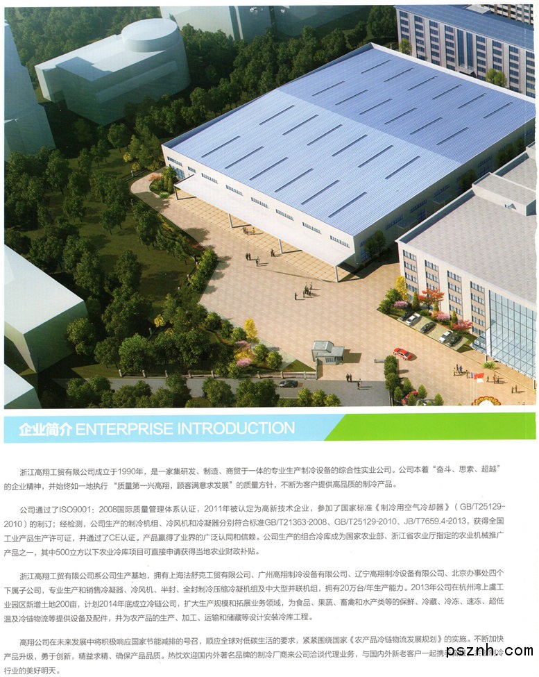 浙江高翔工貿(mào)有限公司系公司生產(chǎn)基地,擁有上海法舒克工貿(mào)有限公司、廣州高翔制冷設備有限公司、沈陽高翔制冷設備有限公司三個下屬子公司,專業(yè)生產(chǎn)和銷售冷凝器、冷風機、半封、全封制冷壓縮冷凝機組及中大型并聯(lián)機組;擁有20萬臺/年生產(chǎn)能力;為食品、果蔬、畜禽和水產(chǎn)類等的保鮮、冷藏、冷凍、速凍、超低溫及冷鏈物流等提供設備及配件,并為農(nóng)產(chǎn)品的生產(chǎn)、加工、運輸和儲藏等設計安裝冷庫工程。