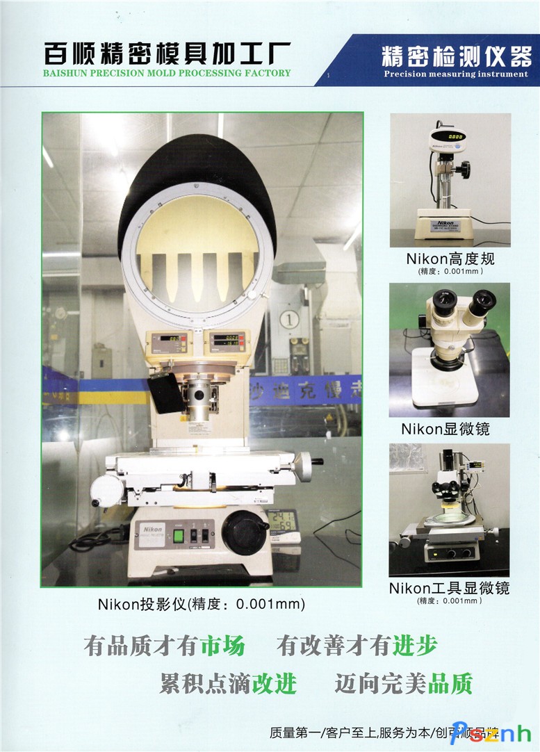 公司擁有高精度檢測設備:尼康投影儀Nikon-V12B精度0.001mm、尼康高度規(guī)Nikon精度0.001mm,二點五次元,三豐分離尺,尼康顯微鏡Nikon.