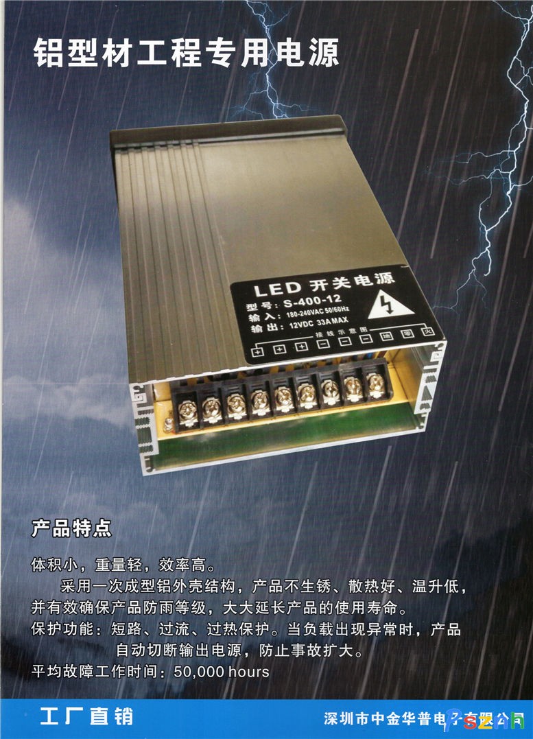 深圳市中金華普電子有限公司是集設計、生產、銷售、服務于一體的專業(yè)電源企業(yè)。公司成立以來,憑先進的技術,多年的開發(fā)、銷售經驗,以完善的品質管理體系、先進的檢測設備、及完善的售后服務,贏得廣大客戶的信賴與支持。目前,本公司已開發(fā)和生產有全系列的AC/DC 、DC/DC、DC/AC高頻開關電源。產品廣泛應用于工業(yè)自控系統(tǒng)、儀器儀表、大屏幕顯示、計算機設備、通訊設備、防盜系統(tǒng)、醫(yī)療設備、軍工等領域。 本公司已經通過ISO9001質量管理體系,保證產品在質量、安全、環(huán)保、節(jié)能等方面均走在了同行業(yè)的前列。產品獲得UL、CE等認證.  本公司備有大量現(xiàn)貨,品種齊全,交貨迅速,愿與一切客戶建立良好的合作關系。并歡迎OEM、ODM。