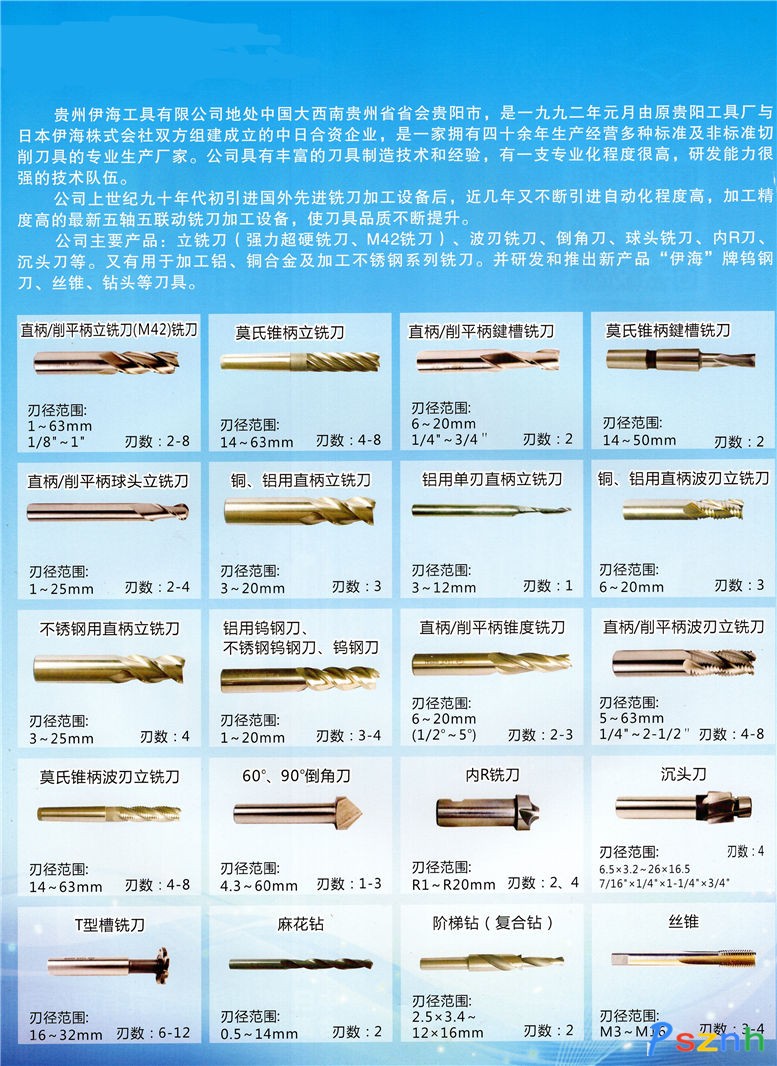 “伊海”牌銑刀及其它系列刀具運(yùn)用國(guó)際先進(jìn)技術(shù),選用優(yōu)質(zhì)高速工具鋼制造。根據(jù)用戶的不同需要,產(chǎn)品具種規(guī)格齊全。既有用于模具加工、機(jī)械加工廣泛使用的立銑刀(強(qiáng)力超硬銑刀、精密超硬銑刀、IKAI-B銑刀、M42銑刀)、波刃銑刀、倒角刀、球頭銑刀、內(nèi)R刀、沉頭刀等。又有用于加工鋁、銅合金及加工不銹鋼系列銑刀。并研發(fā)和推出新產(chǎn)品“伊海”牌鎢鋼刀、絲錐、鉆頭等刀具。“伊海”牌刀具能夠滿足用戶不同加工領(lǐng)域的使用要求。