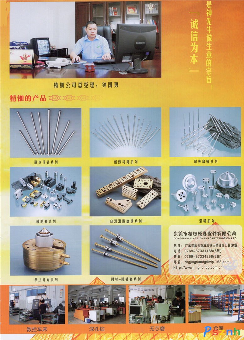 東莞市精鈿模具配件有限公司始創(chuàng)于1998年,正式成立于2002年,主要致力于塑膠模具、壓鑄模具、五金模具及熱流道零件的研發(fā)、生產(chǎn)銷售、技術(shù)支持及售后服務(wù)。東莞市精鈿模具配件有限公司不斷為塑膠模具、壓鑄模具、五金模具熱流道零件的標(biāo)準(zhǔn)化、產(chǎn)業(yè)化及產(chǎn)品的通用性、互換性而不懈努力。   隨著中國(guó)出口模具的蓬勃發(fā)展,為匹配出口模具的高品質(zhì)、交期快的需求,自2003年開始,東莞市精鈿模具配件有限公司全力專注于歐洲美國(guó)亞洲品牌標(biāo)準(zhǔn)塑膠模具配件的中國(guó)制造與技術(shù)支持。并能依循國(guó)標(biāo)GB 、日標(biāo)JIS、德標(biāo)DIN、美標(biāo)AISI等國(guó)際行業(yè)標(biāo)準(zhǔn)制作。   在產(chǎn)品多元化的同時(shí),東莞市精鈿模具配件有限公司在生產(chǎn)加工能力、品質(zhì)控制過程、技術(shù)解決水平、以及整體服務(wù)解決方案方面都有了很大的進(jìn)步與發(fā)展,贏得了客戶的認(rèn)可與信賴。   隨著公司的日益壯大,2009年,公司榮獲了IS09001:2008質(zhì)量標(biāo)準(zhǔn)認(rèn)證并開始拓展海外市場(chǎng)。   我們倡導(dǎo)以高效的、年輕向上的團(tuán)隊(duì)