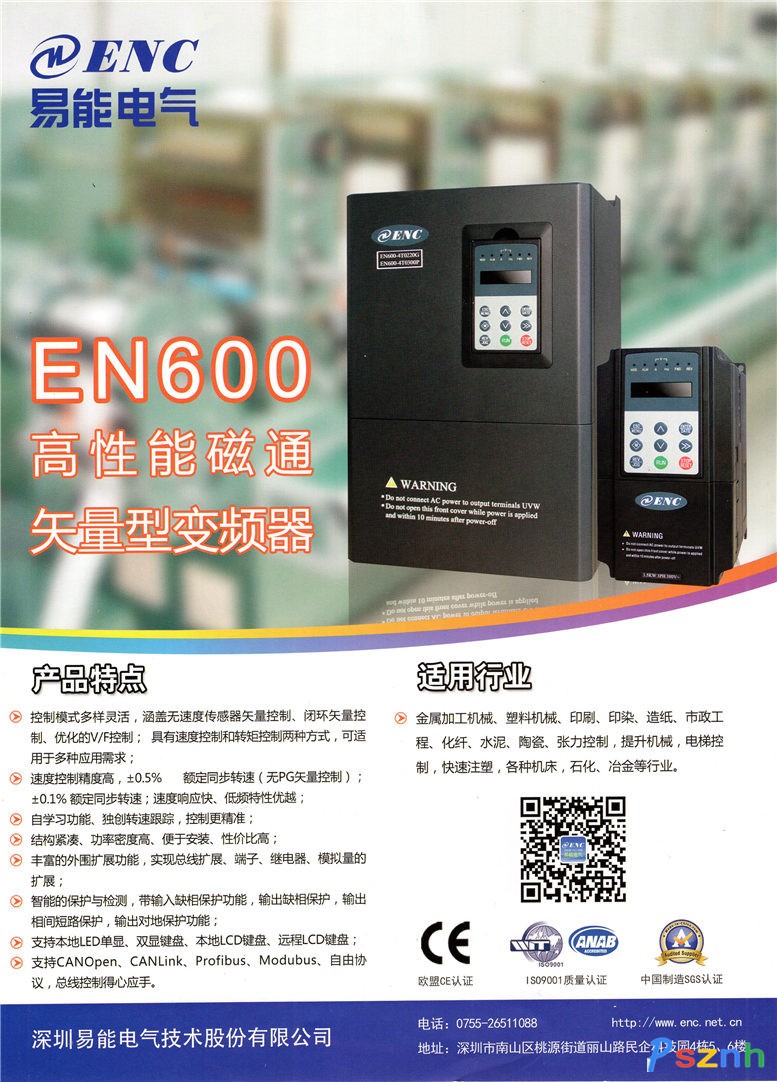 深圳易能電氣技術股份有限公司是一家從事電氣傳動、工業(yè)自動化領域內的產(chǎn)品,包括變頻調速、伺服控制器、PLC等產(chǎn)品研發(fā)、生產(chǎn)與銷售的高科技民營企業(yè),由留學歸國學者沈鴻等一批專家于2004年創(chuàng)立,公司三遷其地不斷發(fā)展擴大,現(xiàn)位于深圳市政府重點扶持的高新科技園區(qū)內 — 民企科技園,公司已通過ISO9001:2008質量管理體系認證、歐盟CE認證;榮獲國家創(chuàng)新基金、深圳市戰(zhàn)略新興產(chǎn)業(yè)基金、十大國產(chǎn)品牌、深圳高新科研補貼、產(chǎn)品創(chuàng)新獎、最具投資價獎等榮譽,是國家級高新技術企業(yè)、深圳市軟件企業(yè)、深圳市信息軟件協(xié)會會員,是多家行業(yè)組織的理事與重要成員。