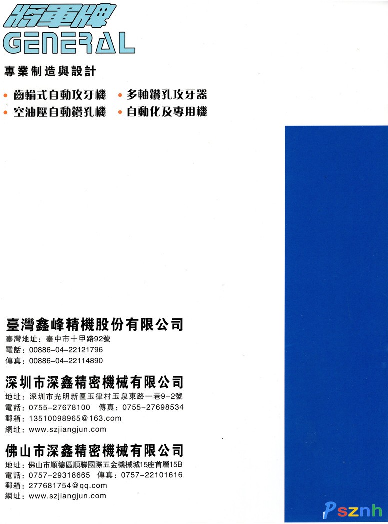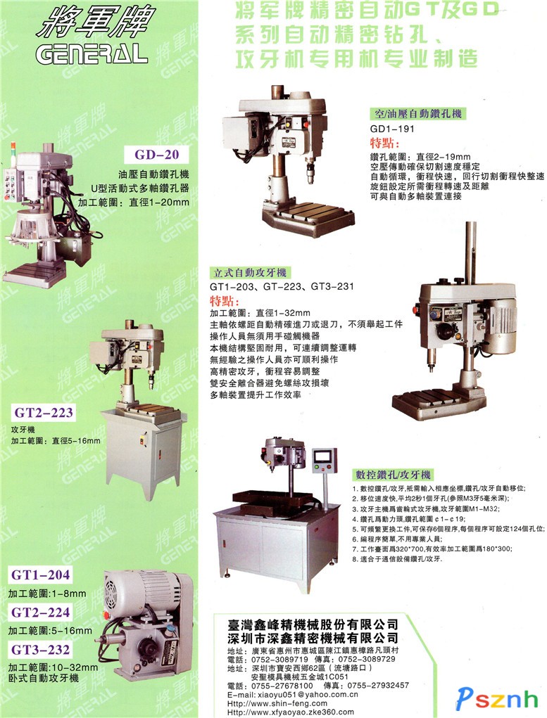 深圳市深鑫精密機(jī)械有限公司成立于1981年,是專業(yè)從事制造 “GENERAL將軍牌”精密自動攻絲機(jī)、精密自動鉆孔機(jī)、多軸鉆孔攻牙器、專用機(jī)等系列產(chǎn)品的知名企業(yè),產(chǎn)品廣泛適用于機(jī)械制造加工行業(yè)及各種種類繁多,大、中、小批量多孔零件加工等領(lǐng)域,如工程機(jī)械制造業(yè)、模具制造業(yè)、能源設(shè)備制造業(yè)、大型冷凍機(jī)及壓縮機(jī)制造業(yè)、鐵路機(jī)車業(yè)、機(jī)動車制造業(yè)、航天航空制造業(yè)、精密電子零件制造業(yè)等。