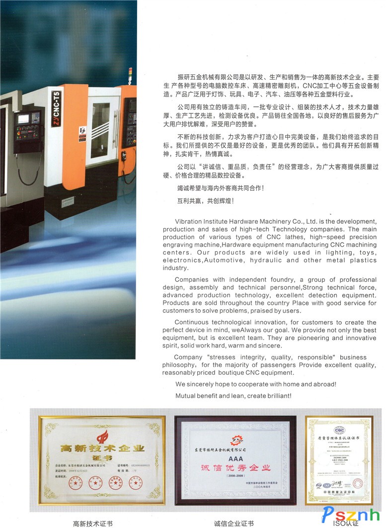 東莞市振研五金機(jī)械有限公司是一家科技與創(chuàng)新相結(jié)合為一體的,全面發(fā)展型企業(yè), 公司專業(yè)生產(chǎn)CNC數(shù)控車床,高速精密雕刻機(jī),CNC加工中心等.在市場(chǎng)竟?fàn)幦找婕ち业那闆r下,公司始終堅(jiān)持以提高產(chǎn)品的性能與質(zhì)量為目標(biāo),完善的售后服務(wù)為宗旨,為公司贏來(lái)了廣大新老客戶的高度贊譽(yù)與推崇,同時(shí)也展現(xiàn)出了公司良好的企業(yè)形象,多家廠商的長(zhǎng)期支持與合作又為公司建立下不可動(dòng)搖的商業(yè)信譽(yù)。