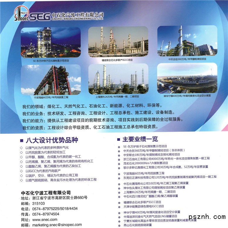 中石化寧波工程有限公司是以技術(shù)為先導(dǎo),設(shè)計(jì)為基礎(chǔ),工程總承包和工程項(xiàng)目管理為主體,集科研開發(fā)、工程咨詢、工程設(shè)計(jì)、設(shè)備制造、裝置施工和檢維修服務(wù)于一體,擁有專利、專有技術(shù),面向國內(nèi)、國際兩個(gè)市場(chǎng)提供技術(shù)服務(wù)和管理服務(wù)的全能型工程公司。