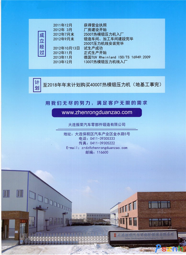 大連振榮汽車零部件鍛造有限公司坐落于美麗的海濱城市——大連,地處新市區(qū)的重點發(fā)展區(qū)域——大連保稅區(qū)汽車產(chǎn)業(yè)區(qū)。公司成立于2011年12月,是集鍛造、模具設(shè)計、模具加工、零部件機械加工于一體的綜合性制造業(yè)企業(yè)。公司現(xiàn)有俄羅斯產(chǎn)2500T熱模鍛壓力機生產(chǎn)線一條、美國產(chǎn)1300T熱模鍛壓力機生產(chǎn)線一條、加工中心和數(shù)控車床等多種現(xiàn)代化的加工設(shè)備。公司非常重視技術(shù)創(chuàng)新,技術(shù)團隊的骨干均有在國外多年從事技術(shù)工作的經(jīng)驗。此外,公司全部管理人員及現(xiàn)場一線員工也有著多年國內(nèi)外鍛造企業(yè)的工作經(jīng)驗,因而可為客戶提供良好的服務(wù),為客戶獲取更多的經(jīng)濟效益提供支持。