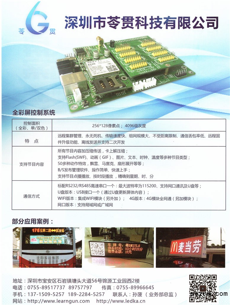 深圳市苓貫科技有限公司,專業(yè)生產(chǎn):【LED控制卡】,【LED顯示屏控制卡】,【LED顯示屏控制系統(tǒng)】是一家集軟、硬件開發(fā)與銷售為一體的高新技術(shù)企業(yè)。 一、【LED控制卡】包括GPRS無線控制卡、CDMA無線控制卡、GSM短信無線控制卡、語音播報控制卡、溫濕度顯示控制卡、U盤控制卡、有線控制卡等; 二、【LED顯示屏控制卡】包括LED小區(qū)顯示屏控制卡、LED門頭顯示屏控制卡、LED公交車顯示屏控制卡、LED出租車顯示屏控制卡等; 三、【LED顯示屏控制系統(tǒng)】包括氣象預(yù)警控制系統(tǒng)、交通誘導(dǎo)屏控制系統(tǒng)、水泥攪拌裝車控制系統(tǒng)、體育比賽倒計時控制系統(tǒng)、打漿機(jī)攪拌顯示控制系統(tǒng)及銀行及醫(yī)院排隊叫號系統(tǒng),同時根據(jù)客戶的需求量身訂做控制系統(tǒng)。 公司的產(chǎn)品全部自主開發(fā),除免費(fèi)提供操作控制軟件外,還提供二次開發(fā)所需的控件或動態(tài)鏈接庫,方便廣大客戶為工程項目量身訂制!公司注重知識產(chǎn)權(quán)保護(hù),為了客戶的滿意,我們愿意做一切,我們的目標(biāo)就是要打造一支精干、團(tuán)結(jié)、專業(yè)、無堅不催的戰(zhàn)斗團(tuán)隊,為用戶提供適用、好用的產(chǎn)品,讓我們共同努力、成就未來! 作為一家專業(yè)的LED顯示屏無線控制系統(tǒng)提供商,我們視品質(zhì)為生命,一直致力于產(chǎn)品品質(zhì)的不斷提升,本企業(yè)所追求產(chǎn)品的各項指標(biāo)都是業(yè)界領(lǐng)先的,同時為了更好的服務(wù)用戶,確保產(chǎn)品品質(zhì),我們建立了健全的質(zhì)量保證體系,對產(chǎn)品生產(chǎn)的整個過程進(jìn)行嚴(yán)格的控制,不斷的改進(jìn)作業(yè)流程和工作方法,使我們生產(chǎn)的產(chǎn)品能夠滿足客戶的各種要求。為了把“苓貫科技” 打造成LED無線領(lǐng)域中的名牌企業(yè),樹立良好的企業(yè)形象,始終恪守“服務(wù)一流,品質(zhì)一流”的承諾,不懈地在LED無線領(lǐng)域內(nèi)開發(fā)新的產(chǎn)品和應(yīng)用,為不同用戶提供不同的產(chǎn)品和解決方案,使客戶獲得更好的經(jīng)濟(jì)效益。 公司宗旨:誠信第一,效率第一,客戶至上,服務(wù)至上。公司承諾:客戶問題在24小時給出準(zhǔn)確的解決方案,48小時內(nèi)將問題全部解決。