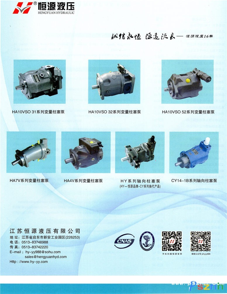 恒源液壓是專業(yè)從事高壓柱塞泵(馬達(dá))研發(fā)、制造的專業(yè)企業(yè),創(chuàng)建于2000年。中國液壓氣動密封工業(yè)協(xié)會會員、中國工程機(jī)械協(xié)會配套件分會會員、江蘇省機(jī)械工程學(xué)會理事單位。產(chǎn)品有HA7V系列、HA10VSO(31/32/52)系列、HA4VSO系列、HY系列(HY-HENGYUAN簡稱-恒源品牌)、CY系列柱塞泵(馬達(dá))等七大系列300多個品種,適用于鍛壓、剪折機(jī)床,金屬回收、工程、建筑、礦山機(jī)械,冶金設(shè)備及船舶、水利、環(huán)保機(jī)械等領(lǐng)域。主要為國內(nèi)主機(jī)、液壓成套企業(yè)提供配套及售后市場服務(wù),并出口歐美、南美、東南亞等國家和地區(qū)。