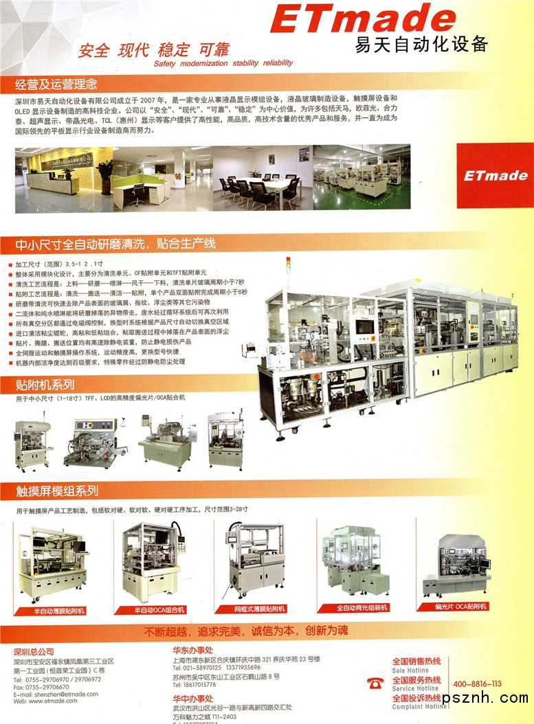 深圳市易天自動(dòng)化設(shè)備股份有限公司成立于2007年,注冊(cè)資金1000萬(wàn),是一家專業(yè)從事液晶顯示模組設(shè)備,液晶玻璃制造設(shè)備,觸摸屏設(shè)備和OLED顯示設(shè)備制造的高科技企業(yè)。公司以“安全”、“現(xiàn)代”、“可靠”、“穩(wěn)定”為中心價(jià)值,為許多客戶提供了高性能,高品質(zhì),高技術(shù)含量的優(yōu)秀產(chǎn)品和服務(wù),并一直為成為國(guó)際領(lǐng)先的平板顯示行業(yè)設(shè)備制造商而努力。