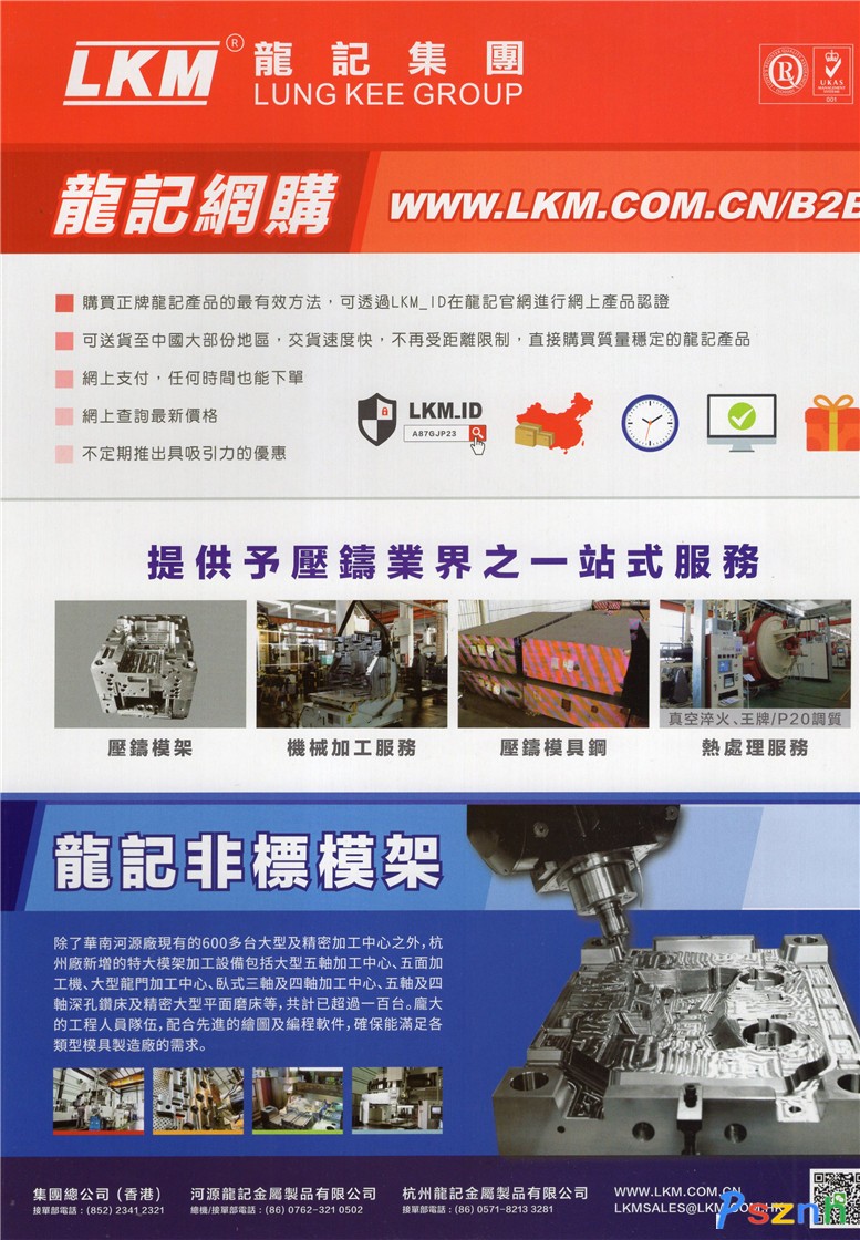 “龍記”這品牌名稱是取自于集團創(chuàng)辦人邵鐵龍先生與邵玉龍先生,而"LKM"品牌就是香港“龍記五金(Lung Kee metal)”的英文簡稱。這接近40年的時間,龍記見證香港和中國模具行業(yè)的高速發(fā)展,也為模架制造行業(yè)開拓先河,包括成為香港首家利用數(shù)控加工中心的模架生產(chǎn)商,和首家于香港主板上市的模架企業(yè),“龍記”和"LKM"也成為國內(nèi)模架標準的代名詞。