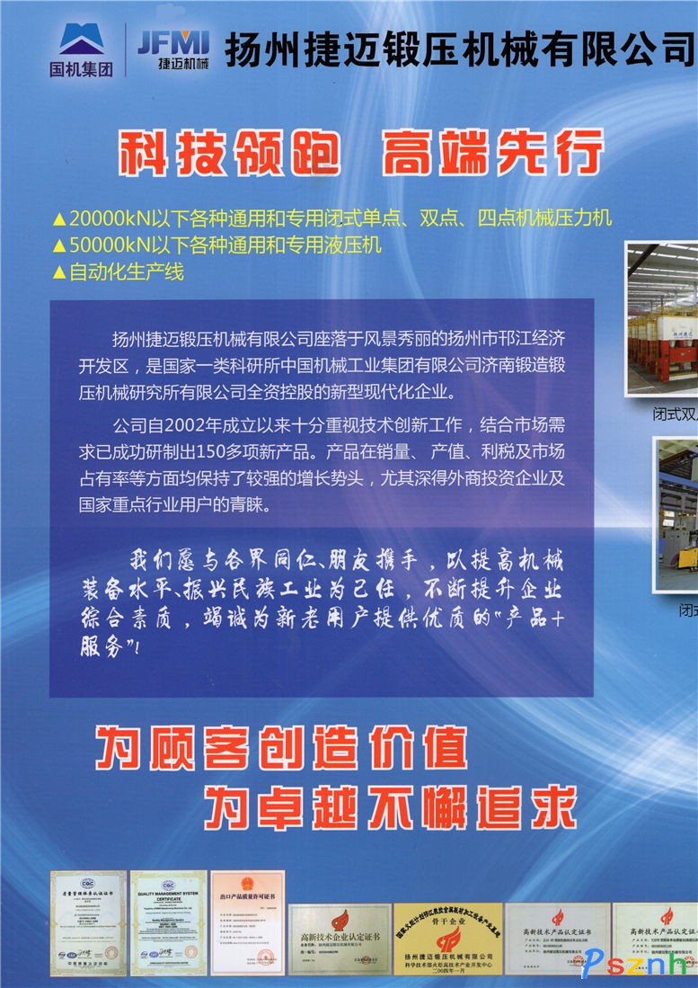 揚(yáng)州捷邁鍛壓機(jī)械有限公司是''揚(yáng)州鍛壓機(jī)床有限公司''與''濟(jì)南鑄造鍛壓機(jī)械研究所''共同投資組建的新型現(xiàn)代化企業(yè)。主要生產(chǎn)各種類型和規(guī)格的液壓機(jī)、閉式機(jī)械壓力機(jī)及其自動化成套設(shè)備。| 公司全體員工按照''揚(yáng)州捷邁--永無止境地超越!''的總體追求,堅(jiān)持貫徹以''開發(fā)新品求生存,拓寬市場求業(yè)績,夯實(shí)基礎(chǔ)求發(fā)展,管理創(chuàng)新求增效''的經(jīng)營管理理念,精心打造“揚(yáng)州捷邁”品牌。公司成立以來,在董事會的正確領(lǐng)導(dǎo)和各級政府部門的關(guān)懷支持下,通過全體員工的共同努力,已先后榮獲:''江蘇省高新技術(shù)企業(yè)”;“江蘇省民營科技企業(yè)”;“江蘇省火炬項(xiàng)目承擔(dān)單位”;“質(zhì)量、信譽(yù)先進(jìn)單位”;“工商銀行資信AA等級”;“國家火炬計(jì)劃邗江金屬板材加工設(shè)備產(chǎn)業(yè)基地骨干企業(yè)”等榮譽(yù)稱號;揚(yáng)州市大型鍛壓設(shè)備及成套化、集成化工程技術(shù)研發(fā)中心和揚(yáng)州市級企業(yè)技術(shù)中心就設(shè)在本公司。| 公司充分利用投資雙方多年來在鍛壓產(chǎn)品領(lǐng)域所積累的產(chǎn)品設(shè)計(jì)開發(fā)經(jīng)驗(yàn)和在機(jī)械加工制造方面的特有優(yōu)勢,以及已形成的遍布全國的銷售服務(wù)網(wǎng)絡(luò),向市場提供先進(jìn)、高效、實(shí)用、可靠的優(yōu)質(zhì)鍛壓產(chǎn)品。以其產(chǎn)品在性能、質(zhì)量、價格、服務(wù)、周期、信譽(yù)等方面的綜合優(yōu)勢,限度地去滿足不同用戶的不同層次的需求。|| 揚(yáng)州捷邁人堅(jiān)信: 沒有不講理的用戶| 只有不滿意的產(chǎn)品| 用戶滿意是我們永遠(yuǎn)的追求!
