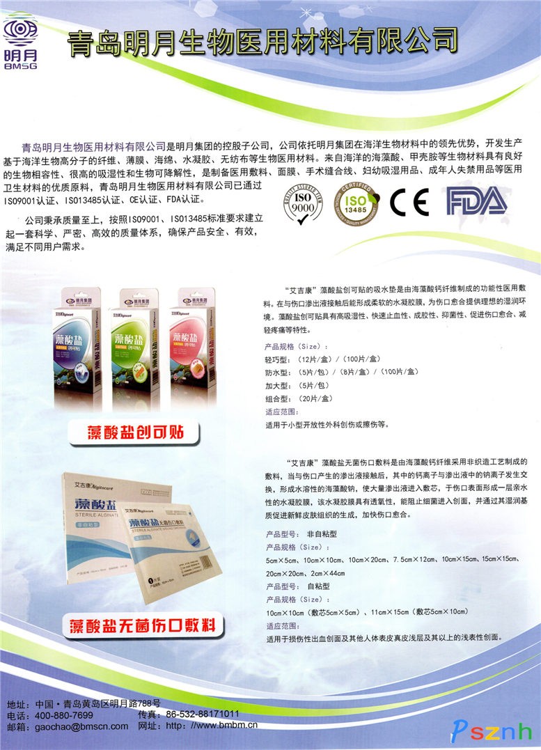 青島明月生物醫(yī)用材料有限公司 海藻酸鹽纖維 無(wú)紡布 敷料