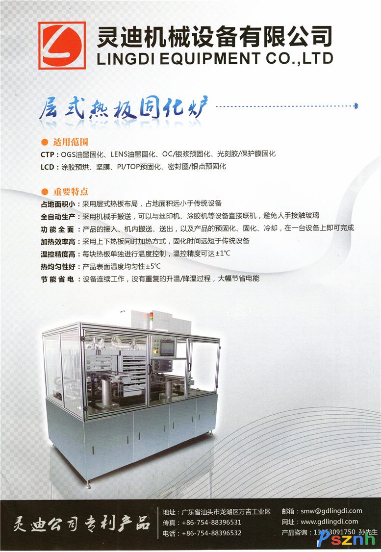 靈迪機(jī)械設(shè)備有限公司是集研發(fā)、制造、銷售、服務(wù)為一體的高新設(shè)備制造廠家。公司擁有多年CTP/LCD/TP行業(yè)設(shè)備制造經(jīng)驗,以滿足用戶要求為宗旨,不斷吸收創(chuàng)新,保持先進(jìn)性,保證設(shè)備實用、穩(wěn)定、高效,為各企業(yè)在提高產(chǎn)品質(zhì)量、產(chǎn)能及降低成本等方面都取得明顯效益。