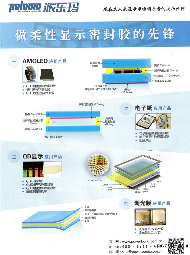 派樂瑪專注于光電顯示器件制程密封膠,及其材料創(chuàng)新技術(shù)解決方案的提供,特別是在UV光固化技術(shù)領(lǐng)域,派樂瑪是國內(nèi)同業(yè)領(lǐng)先企業(yè)。公司秉承“以化學(xué)技術(shù)持續(xù)創(chuàng)新推動(dòng)人類進(jìn)步”的企業(yè)使命,深耕于光電顯示領(lǐng)域,并延伸于半導(dǎo)體、微電子部件;智能工業(yè)、汽車;智能家居、建筑領(lǐng)域。核心技術(shù)產(chǎn)品涵蓋了LCD、觸控屏、AMOLED、QDEF、3D顯示、柔性顯示器件、E-Paper,以及其他新型顯示技術(shù)應(yīng)用的粘合、密封材料與解決方案。