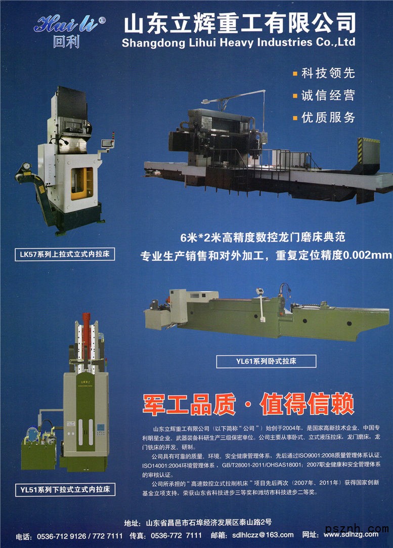 山東立輝重工有限公司(以下簡稱“公司”)始創(chuàng)于2004年,是山東省高新技術(shù)企業(yè)、中國專利明星企業(yè)、武器裝備科研生產(chǎn)三級保密單位。公司主要從事臥式、立式液壓拉床的開發(fā)、研制、經(jīng)營活動,公司所承擔的“高速數(shù)控立式拉削機床”項目先后兩次(2007年、2011年)獲得國家創(chuàng)新基金立項支持,榮獲山東省科技進步三等獎和濰坊市科技進步二等獎。