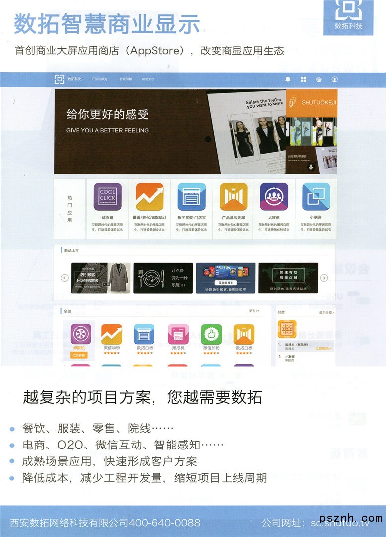 數(shù)拓科技由海外歸國(guó)人士組建,是國(guó)內(nèi)最早的移動(dòng)互聯(lián)網(wǎng)應(yīng)用開(kāi)發(fā)商之一。公司專(zhuān)注于數(shù)字化展示技術(shù)、互動(dòng)技術(shù)、移動(dòng)互聯(lián)網(wǎng)技術(shù)、云技術(shù)、物聯(lián)網(wǎng)技術(shù)的商業(yè)化應(yīng)用,為集團(tuán)公司、政府機(jī)關(guān)、金融銀行、醫(yī)療教育、中小企業(yè)、零售門(mén)店等政企、商業(yè)用戶(hù)提供完整的數(shù)字化營(yíng)銷(xiāo)解決方案。數(shù)拓科技的主要產(chǎn)品包括數(shù)字易拉寶、數(shù)字餐牌、數(shù)字收銀臺(tái)、觸摸導(dǎo)購(gòu)臺(tái)、數(shù)字公告欄、互動(dòng)拼接屏等一系列軟硬件結(jié)合的數(shù)字化營(yíng)銷(xiāo)產(chǎn)品。其主要特點(diǎn)是用手機(jī)、平板電腦通過(guò)行業(yè)應(yīng)用模板快速制作展示內(nèi)容并管理屏幕播放,展示內(nèi)容在數(shù)字大屏幕上以動(dòng)態(tài)形式播放,配合攝像頭、近場(chǎng)通信模塊、觸摸屏幕實(shí)現(xiàn)更多互動(dòng)功能。
