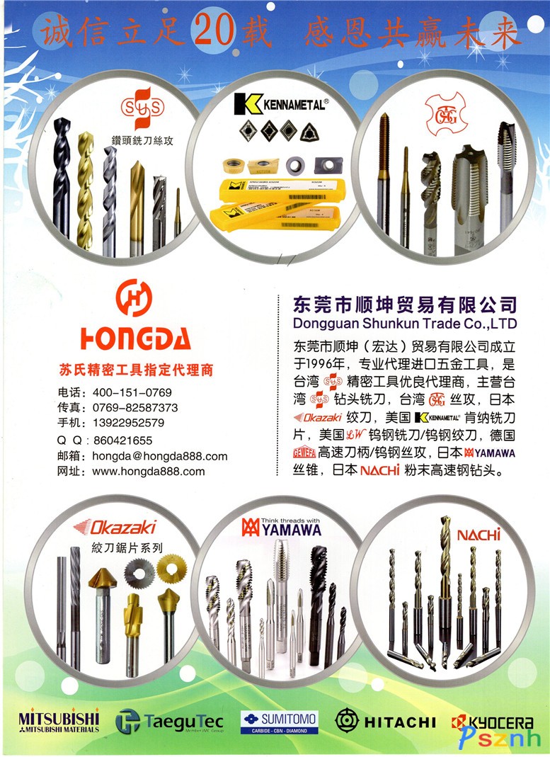 東莞市順坤貿(mào)易有限公司本公司是一家專業(yè)從事進(jìn)口五金工具代理銷售的貿(mào)易公司。公司成立于1996年,大陸總部位于廣東省東莞市厚街鎮(zhèn)。 公司始終秉持“誠(chéng)信為本、專業(yè)服務(wù)、求精求變、共創(chuàng)雙贏”的經(jīng)營(yíng)理念,結(jié)合行業(yè)優(yōu)勢(shì),憑著優(yōu)異的產(chǎn)品質(zhì)量,準(zhǔn)確的交貨期,有競(jìng)爭(zhēng)力的價(jià)格,加之在存豐富,即納完備的公司實(shí)力和多年的銷售服務(wù)經(jīng)驗(yàn),贏得了業(yè)內(nèi)人士的肯定和廣大客戶的支持,相繼在廣州、東莞市塘廈鎮(zhèn)、東莞市長(zhǎng)安鎮(zhèn)、廣東省中山市、浙江省寧波市,江蘇省吳江市,江蘇省蘇州市,江蘇省無(wú)錫市,上海市,天津市,等地成立了分公司。 未來(lái),公司將持續(xù)追求卓越,務(wù)實(shí)創(chuàng)新,把握市場(chǎng)脈搏,為新老客戶提供最具性價(jià)比的產(chǎn)品及最優(yōu)質(zhì)的服務(wù)。 公司主要代理銷售的產(chǎn)品有:臺(tái)灣SUS鉆頭、銑*;美國(guó) LW高速鎢鋼*具;德國(guó)GEWEFA HSK高速*柄和高精度絲攻;日本 OKAZAKI岡崎絞*絲列;日本YAMAWA絲攻、板牙;日本OKABE 中心鉆頭;日本UHT/LIH氣動(dòng)工具及研磨配件;日本XBC 纖維油石;日本三菱/日立*粒,日本TECLOCK,Mitutoyo測(cè)量工具;臺(tái)灣LV、HKF鎢鋼銑*;臺(tái)灣AW*把;臺(tái)灣BEST一品*工具;臺(tái)灣CHEN 舍棄式*桿;及其它CNC周邊附件等。