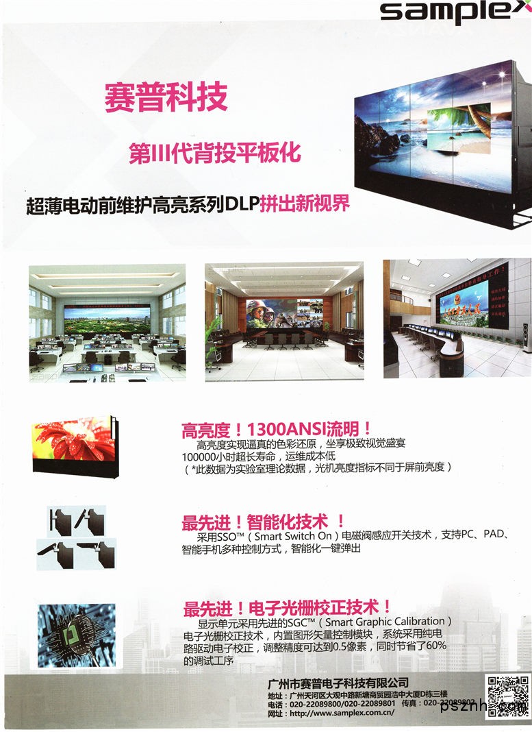 廣州市賽普電子科技有限公司專注于從事超高分辨率大屏幕顯示系列產(chǎn)品的研發(fā)和生產(chǎn),產(chǎn)品主要包括超薄前維護(hù)DLP拼接顯示單元、OLED拼接透明屏及OLED鏡面屏、DID液晶拼接顯示單元、等離子拼接顯示單元、圖像拼接處理器、大尺寸LCD顯示單屏及觸摸屏、矩陣等各種外圍設(shè)備,以及控制軟件、觸控應(yīng)用軟件等。在光學(xué)、電子、機(jī)械、圖像處理、信息傳輸、觸摸屏控制及應(yīng)用軟件等多個(gè)專業(yè)領(lǐng)域均擁有與大屏幕顯示相關(guān)的核心技術(shù)。