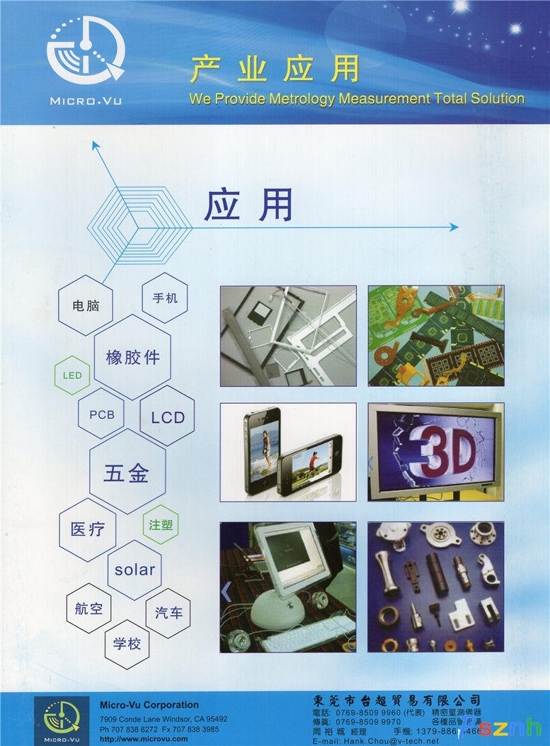 四、產(chǎn)業(yè)應(yīng)用: 1.精密橡膠塑膠:長度,寬度,高度,厚度,弧度,距離,正位度,色差分析,粗度分析2.精密模具:長度,寬度,高度,厚度,弧度,距離,正位度3.PCB:板厚,錫點(diǎn)直徑面積正位度,線寬,V-Cut, Lay out, 金手指,表面瑕疵觀察4.光罩網(wǎng)板尺寸檢查,表面瑕疵觀察5.半導(dǎo)體封裝導(dǎo)線架尺寸檢查,表面瑕疵觀察,照相6.五金沖壓零件:長度,寬度,高度,厚度,弧度,距離,正位度,粗度分析,表面瑕疵察7.汽車零件,通訊零件,手機(jī)零件,3C零件,Connecter零件尺寸檢查,表面瑕觀察五、使用中的客戶群: 鴻海,英業(yè)達(dá),旭麗,虹光,達(dá)方,楠梓電,明碁,全友,福懋,達(dá)碁,碧悠,勝華,嘉彰,臺達(dá)……450多家