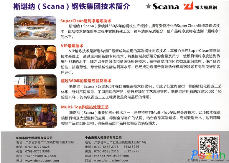 東莞市振大模具鋼有限公司成立于1993年。經(jīng)過20年的發(fā)展,振大成為模具鋼領(lǐng)域的領(lǐng)跑者。2014年1月,經(jīng)過瑞典斯堪納(Scana)鋼鐵公司半年的考核,振大公司獲得“Scana”這個(gè)世界頂級(jí)品牌工具鋼的首批廣東代理權(quán)。這是振大人多年來真誠(chéng)付出的回報(bào),也是斯堪納對(duì)振大一直信奉“誠(chéng)信經(jīng)營(yíng),物盡所用”價(jià)值觀的認(rèn)同。斯堪納與振大攜手同行,為中同客戶提供最優(yōu)的模具解決方案,共創(chuàng)美好未來。