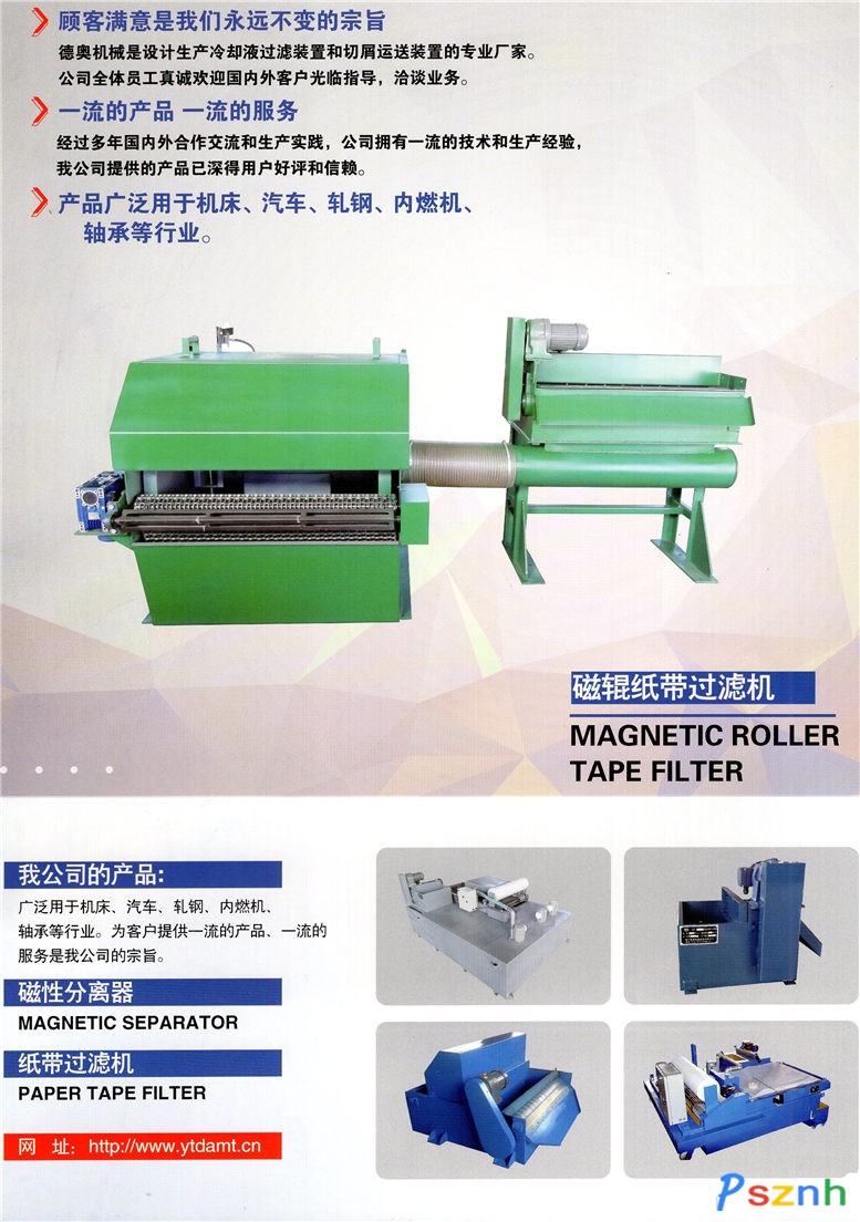 煙臺(tái)德奧機(jī)械設(shè)備有限公司 產(chǎn)品主要有:重力式紙帶過濾機(jī)、圓柱面磁性分離器、梳齒磁性分離器、鼓形紙帶過濾機(jī)、磁性排屑器、鏈板排屑器、刮板排屑器、旋流器、空氣真空紙帶過濾機(jī)、液體真空紙帶過濾機(jī)、預(yù)涂助濾過濾機(jī)、板式精密紙帶過濾機(jī)、磁棒分離器、反洗濾網(wǎng)筒式過濾機(jī)、螺旋排屑器、 盤式油水分離器、離心過濾機(jī)。是設(shè)計(jì)生產(chǎn)冷卻液過濾裝置和切悄運(yùn)送裝置的專業(yè)廠家。經(jīng)過多年國內(nèi)外合作交流和生產(chǎn)實(shí)踐,公司擁有一流的技術(shù)和生產(chǎn)經(jīng)驗(yàn),我公司 提供 的產(chǎn)品已深得用戶好評(píng)和信賴。
