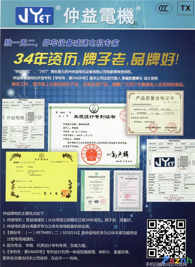 蘇州仲益電機設(shè)備有限公司為全臺灣首創(chuàng)第一家給立體車庫行業(yè)配套電機廠家。擁有自主設(shè)計專利證書,如日本,中國大陸等地。