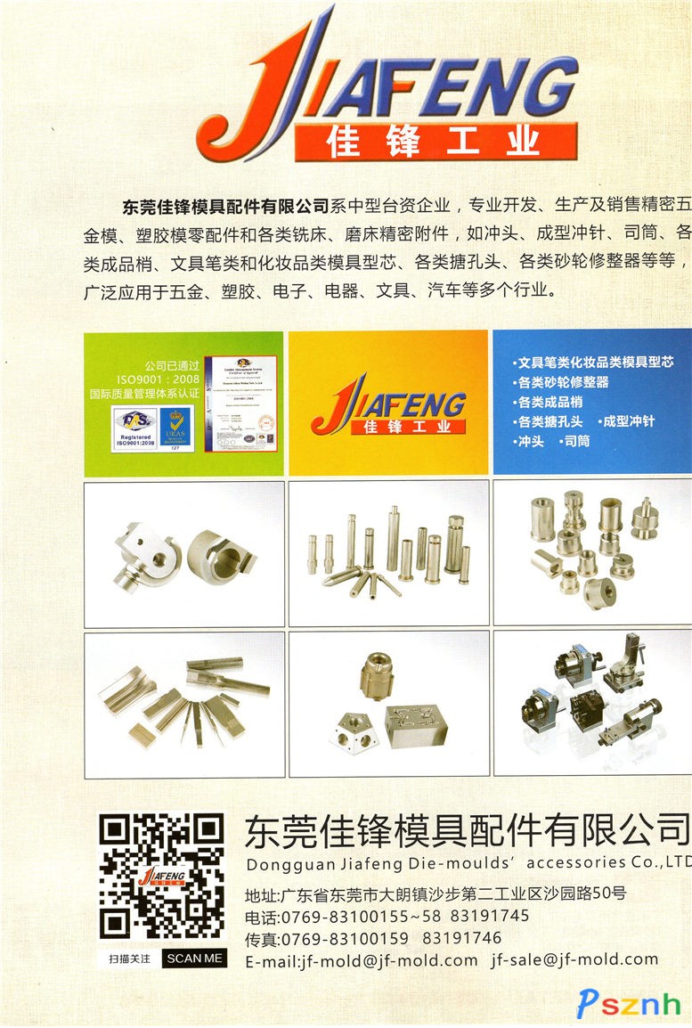 東莞佳鋒模具配件有限公司是一家臺(tái)商獨(dú)資對(duì)外加工企業(yè),始創(chuàng)于1998年,主要生產(chǎn)經(jīng)營(yíng)五金模、塑膠模零件。幾年來(lái),經(jīng)過公司領(lǐng)導(dǎo)和全體員工的不懈努力,佳鋒公司取得了一定規(guī)模的發(fā)展,不論是產(chǎn)品種類,還是加工工藝、技術(shù)水平都有了很大的提高,完成了從簡(jiǎn)單的沖壓模到復(fù)雜的塑膠模和高精度端子模的轉(zhuǎn)變;客戶群體也由沿海不斷地向內(nèi)地深入,產(chǎn)品范圍覆蓋了五金、塑膠、電器、汽車、文具和化妝品等多個(gè)行業(yè)。