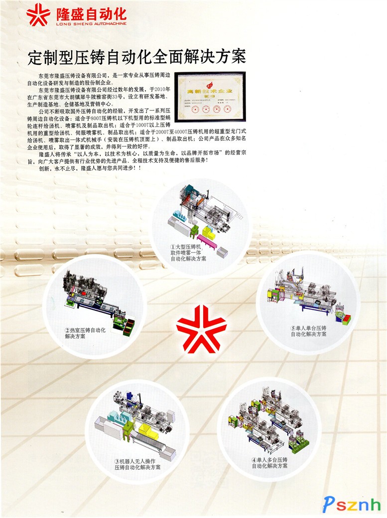 東莞市隆盛壓鑄設(shè)備有限公司(原東莞市耀盛自動(dòng)化設(shè)備有限公司),是一家專業(yè)從事壓鑄周邊自動(dòng)化設(shè)備研發(fā)與制造的股份制企業(yè)。東莞市隆盛壓鑄設(shè)備有限公司經(jīng)過(guò)數(shù)年的發(fā)展,于2010年在廣東省東莞市大