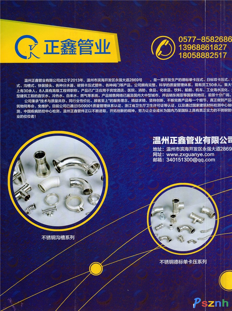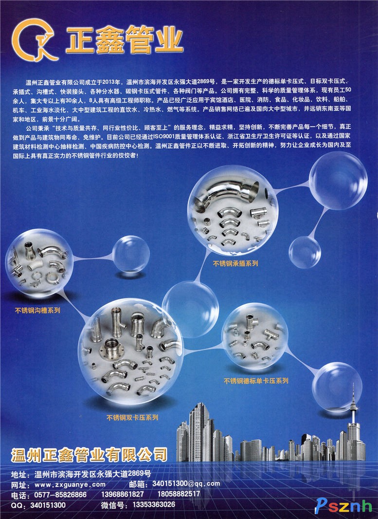 溫州正鑫管業(yè)有限公司  公司生產(chǎn)的不銹鋼管道系統(tǒng),按照國家標準生產(chǎn),卡壓和承插焊接連接用管材規(guī)格DN15-100mm, 管件品種有對接頭(等徑、異徑)、三通(等徑、異徑)、彎頭(90º、45º、A型、B型、異徑)、轉(zhuǎn)換 接頭(內(nèi)螺紋、外螺紋、螺母、法蘭)等,規(guī)格品種齊全,可以與既有的各種管道系統(tǒng)實行連接。 DN100~300mm的連接方式為氬弧焊接和溝槽式連接方式。管道系統(tǒng)的工作壓力為1.6Mpa-3.0Mpa,工作 溫度范圍為-20℃-130℃。管道系統(tǒng)具體的規(guī)格品種和技術(shù)參數(shù)詳見產(chǎn)品樣本。
