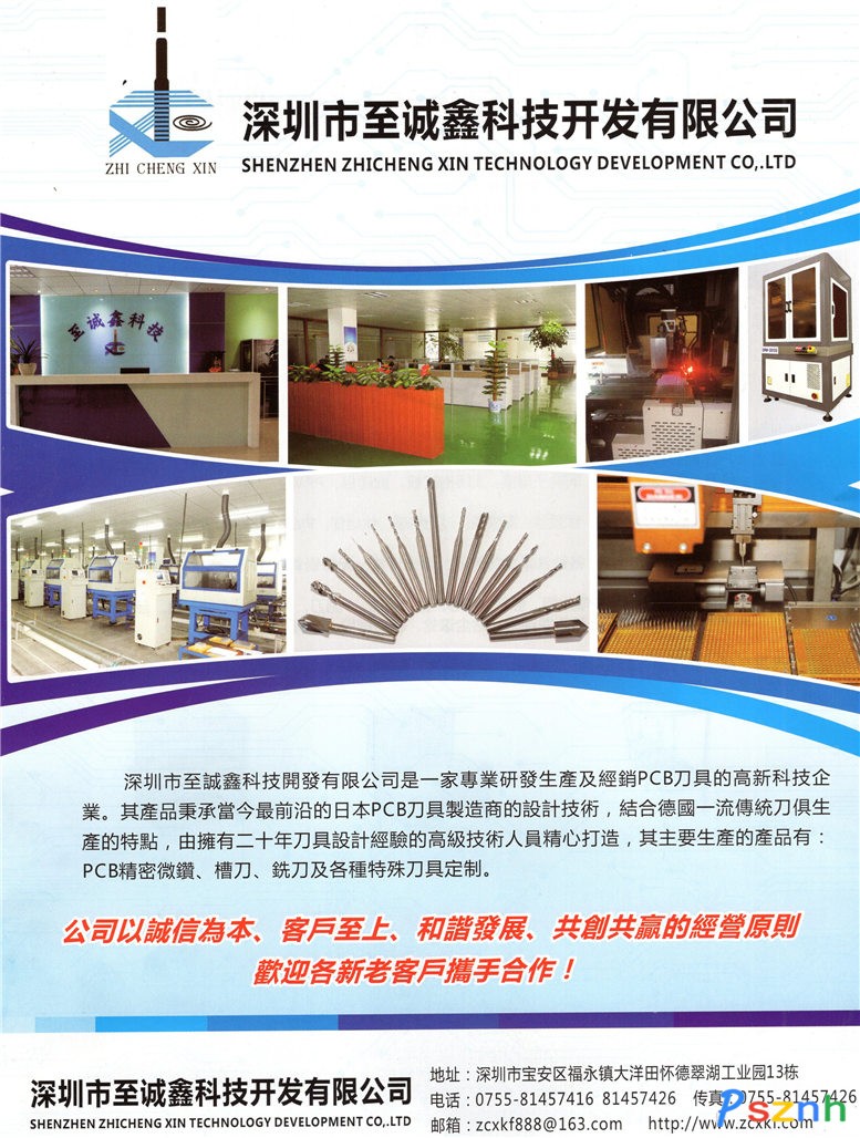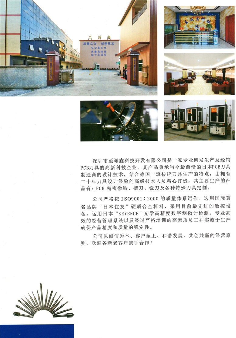 深圳市至誠(chéng)鑫科技開發(fā)有限公司成立于2003,是一家專業(yè)研發(fā)和生產(chǎn)硬質(zhì)合金高精密PCB專用鉆頭,銑刀,槽刀的高科技企業(yè)。公司所有半成品到成品的各工序,引進(jìn)中國(guó)先進(jìn)的微鉆自動(dòng)化生產(chǎn)設(shè)備,自主配備完善了技術(shù)研發(fā)部門,引進(jìn)了行業(yè)最高精度的鐳射全自動(dòng)檢測(cè)設(shè)備,完善的品質(zhì)管理系統(tǒng),公司一直以來,堅(jiān)持“科技以人為本,創(chuàng)新創(chuàng)造成功未來”理念。建立一整套來格管理模式。